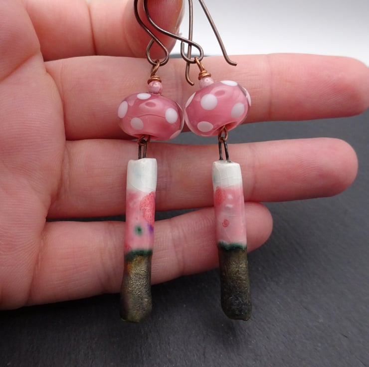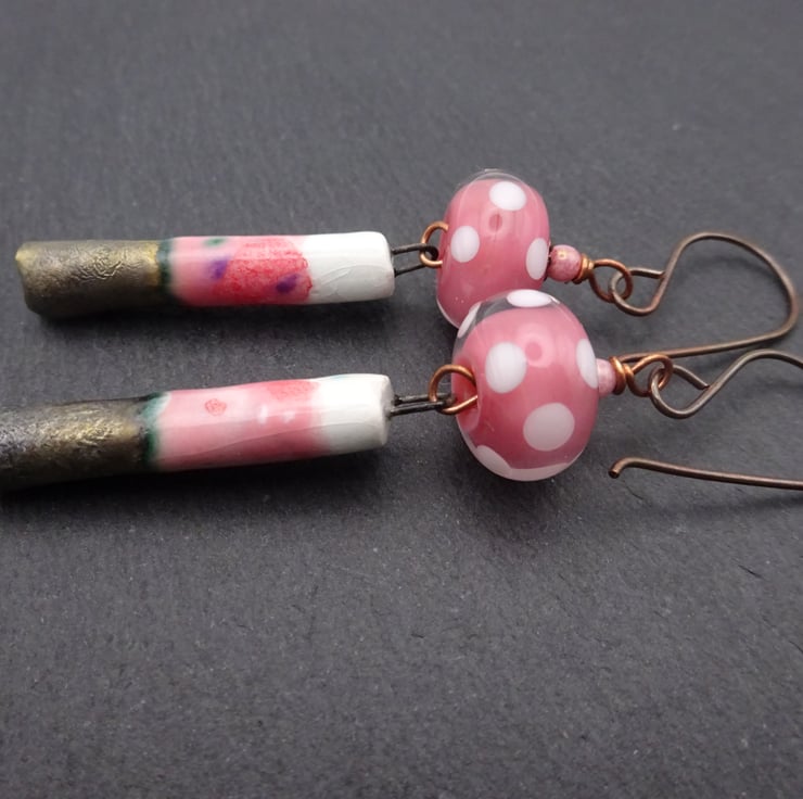 A pair of earrings made with handmade copper ear wires, my handmade lampwork glass beads which have been made with pink glass and features white polka dots and a pair of handmade ceramic charms.