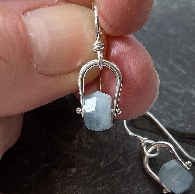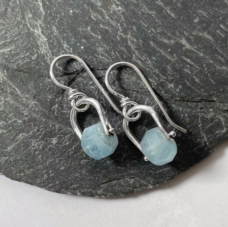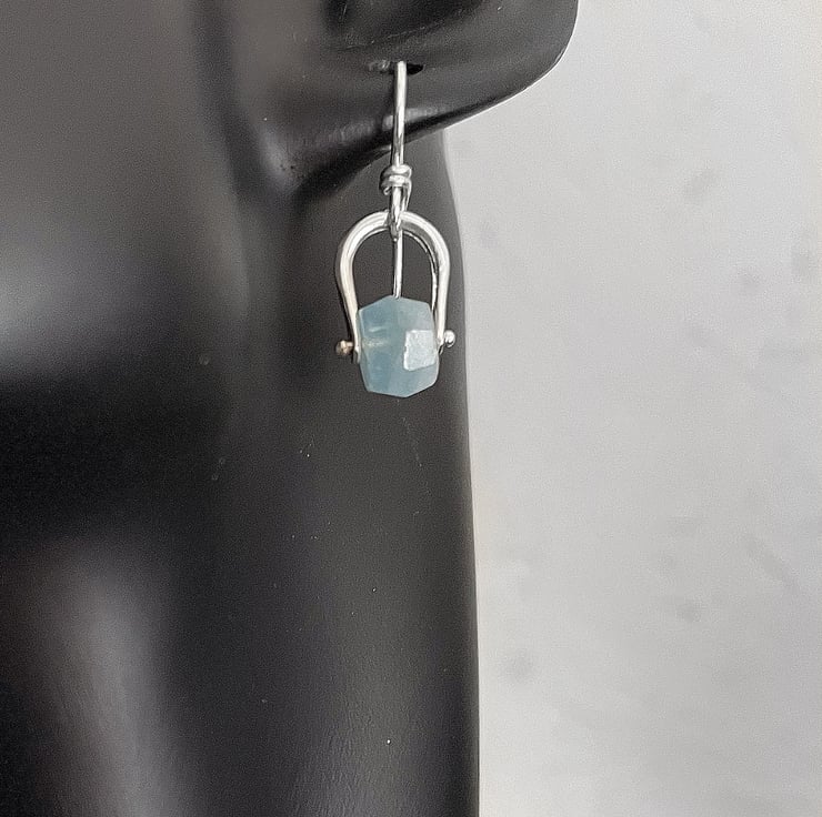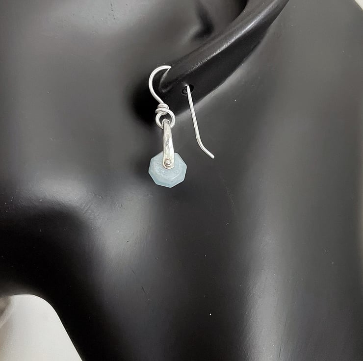 Sterling silver and faceted aquamarine small dangly castor like earrings on handmade hooks.