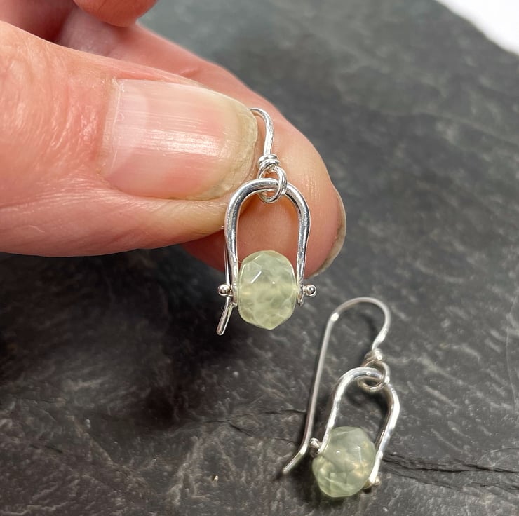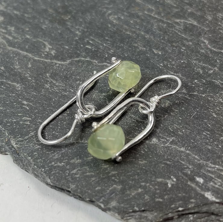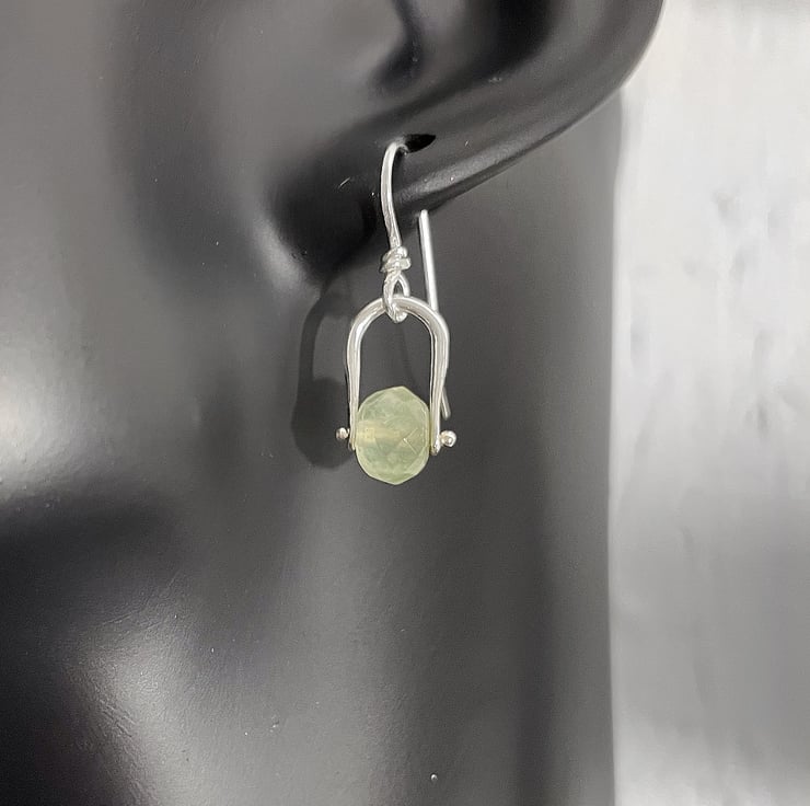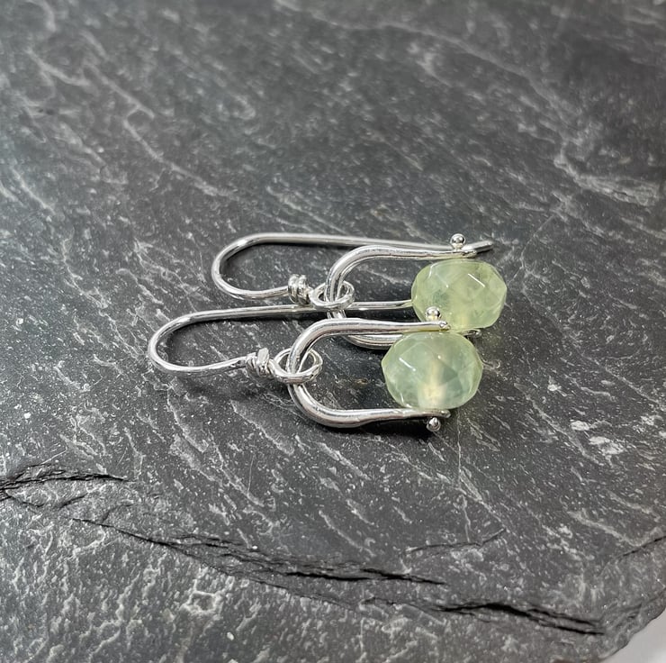 Sterling silver and faceted prehnite small dangly castor like earrings on handmade hooks.