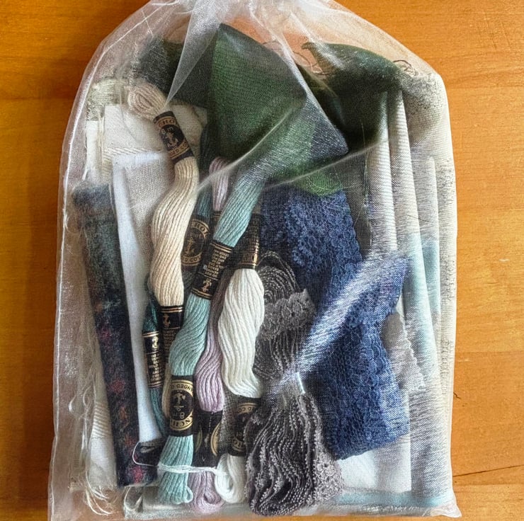 The pack contain a large piece of upholstery fabric, various smaller pieces of fabric, lace/trim/ribbon, & colorful embroidery threads.Everything you need to get started on your project all in the little kit.