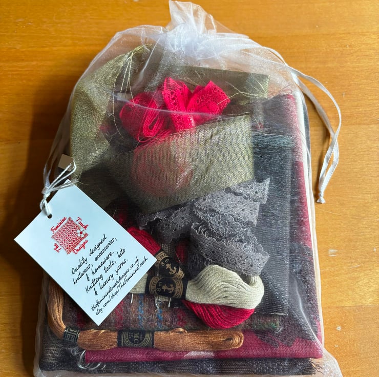 The pack contain a large piece of upholstery fabric, various smaller pieces of fabric, lace/trim/ribbon, & colorful embroidery threads.Everything you need to get started on your project all in the little kit.