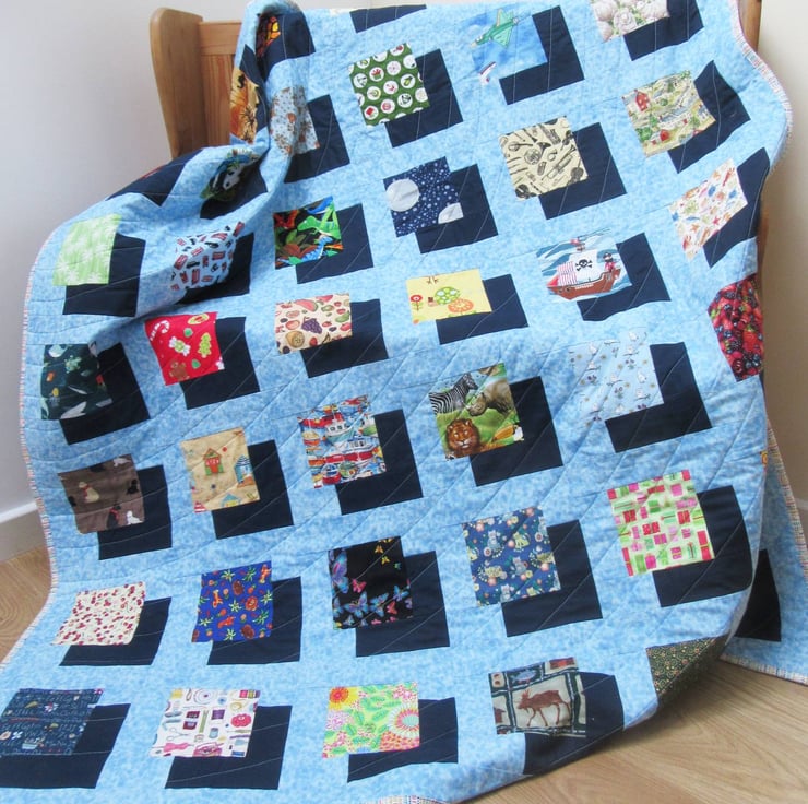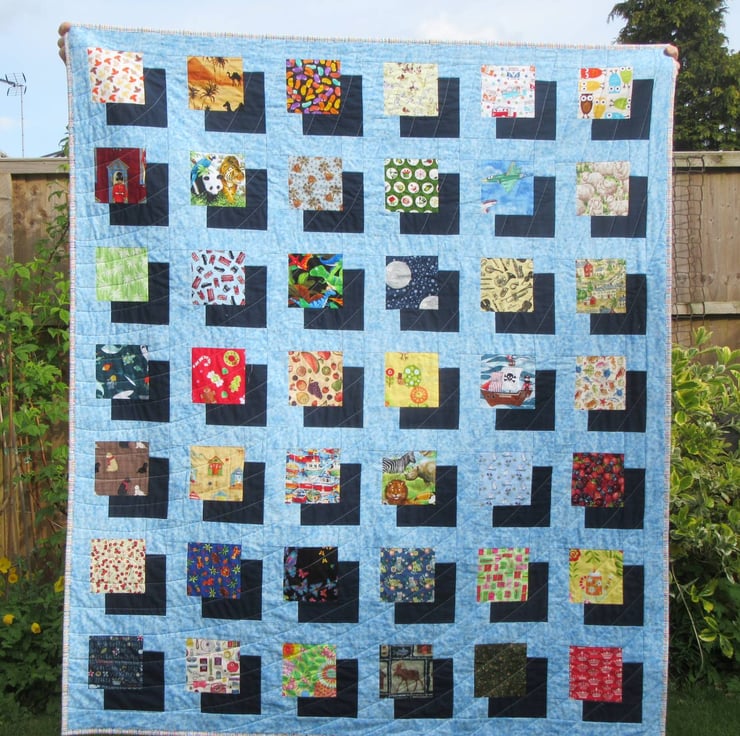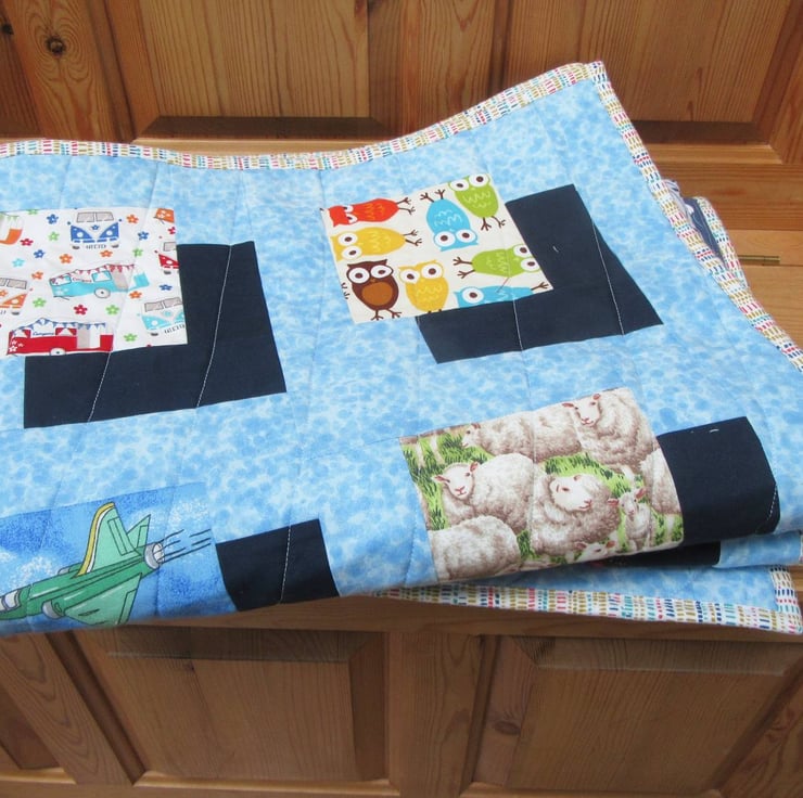 Play I-Spy anywhere! A cosy quilted blanket with an inbuilt game to keep children (and their families and friends) busy playing and learning. All the 4.5" (11.5cm) squares are cut from novelty fabrics with images ranging from aeroplanes to elephants, beach huts to tigers, jelly beans to sheep and so much more.