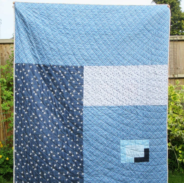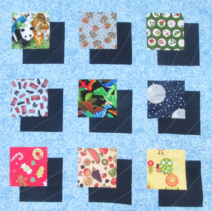 For the quilting (that holds all the layers of the quilt together) I've stitched arcs echoing across the quilt from the top left hand corner. These emphasise the darker blue 'shadows' under each of the novelty print squares and help to give the impression that the squares are floating above the quilt.
