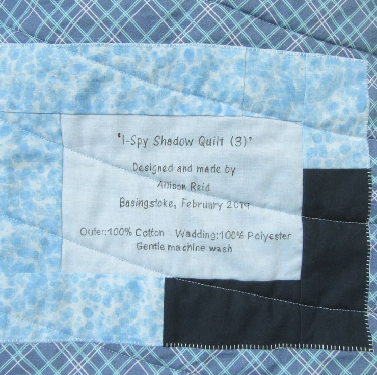 Around the edge of the quilt is a cotton, double thickness homemade binding. I've stitched a label to the back giving details of when and where the quilt was made.