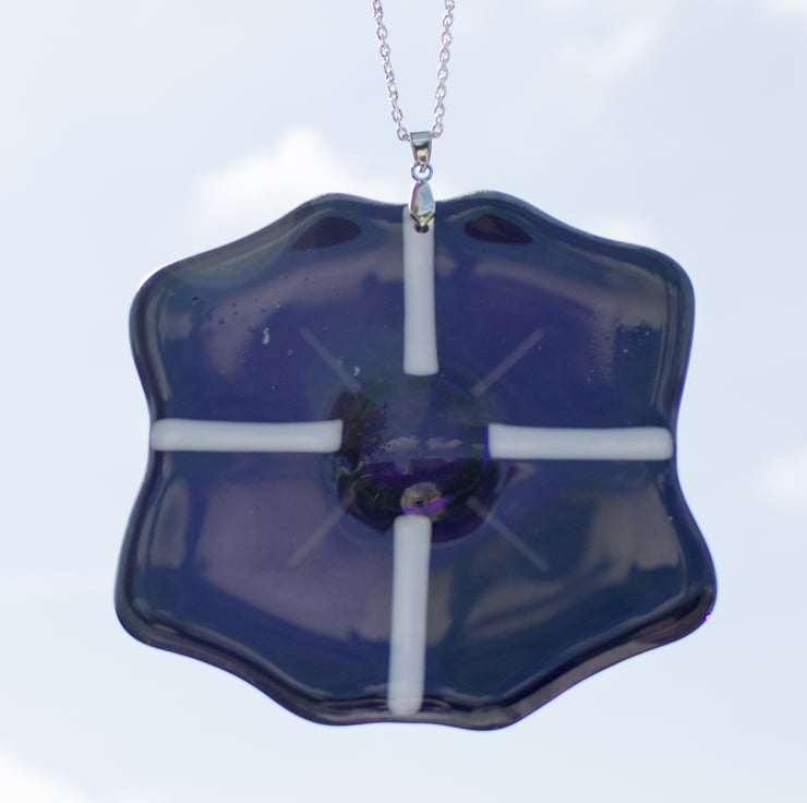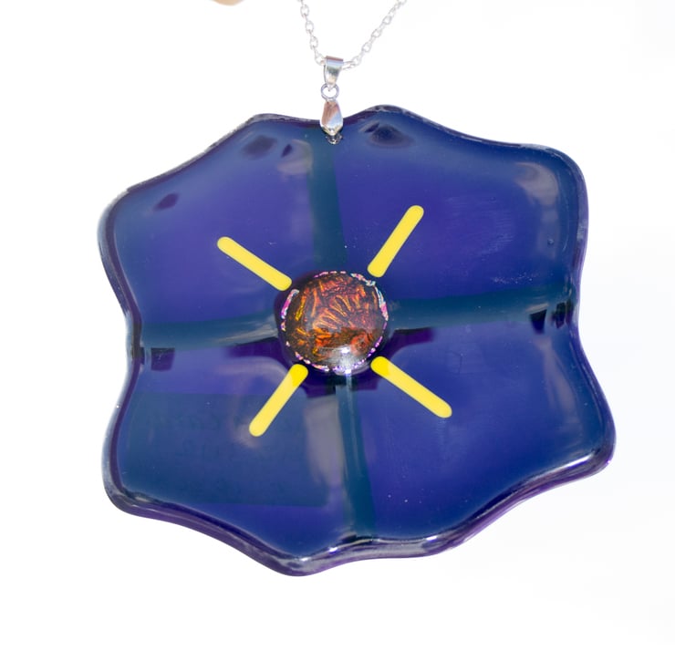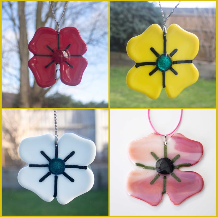 Each poppy is made from 4 hand-cut pieces of glass which are assembled with a pre-fused glass dot and glass rods to make the patterns. A 12-hour program of heating and cooling fuses the glass together after which we drill a hole and fit a bail and the chain.
