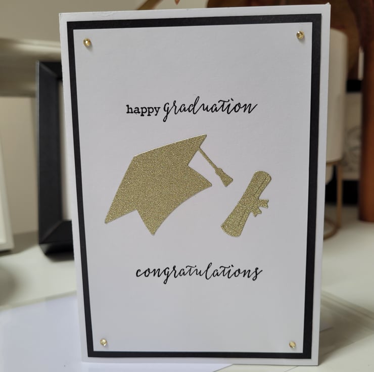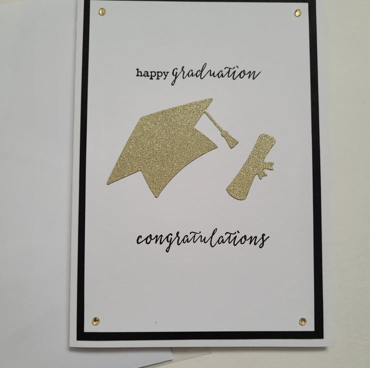 Handmade card made from white and contrasting black card, featuring a mortarboard and scroll made from champagne gold (non-shedding) glitter cardstock in the centre of the card, and ‘happy graduation’ and ‘congratulations’ sentiments stamped in black ink, and finished off with 4 champagne gold rhinestones on each corner of the card.