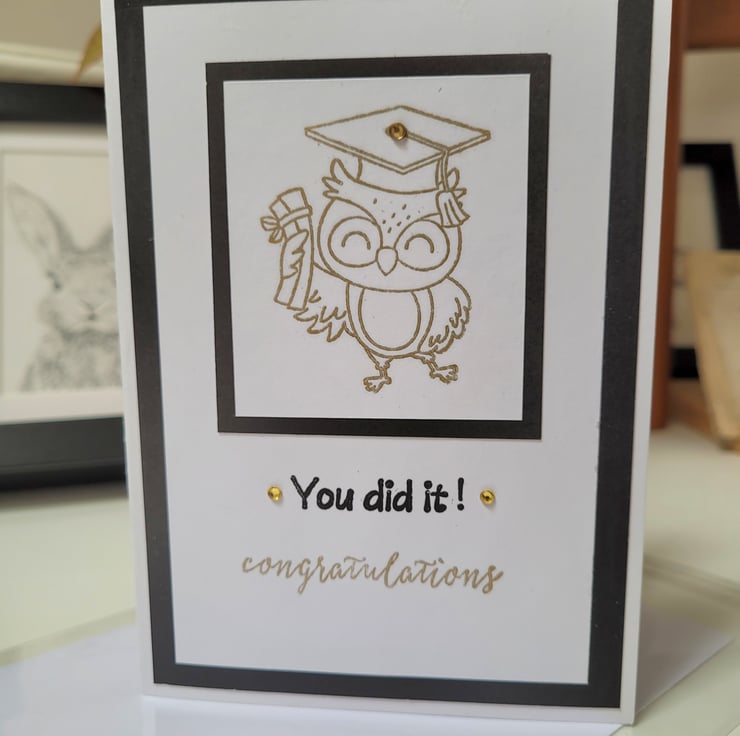 Handmade card made from white and contrasting black card, featuring an owl (wearing a mortarboard and clutching a scroll) stamped in gold, a ‘you did it’ sentiment stamped in black, a ‘congratulations’ sentiment stamped in gold, and finished off with 3 small gold rhinestones.