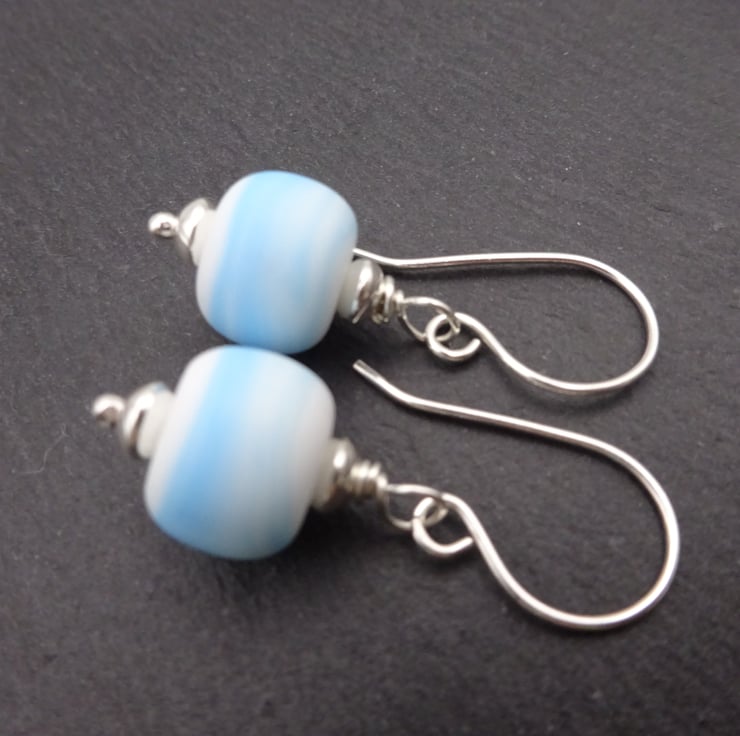 The beads have been made with white glass and wrapped with blue glass, they have been tumbled to give a smooth finish.