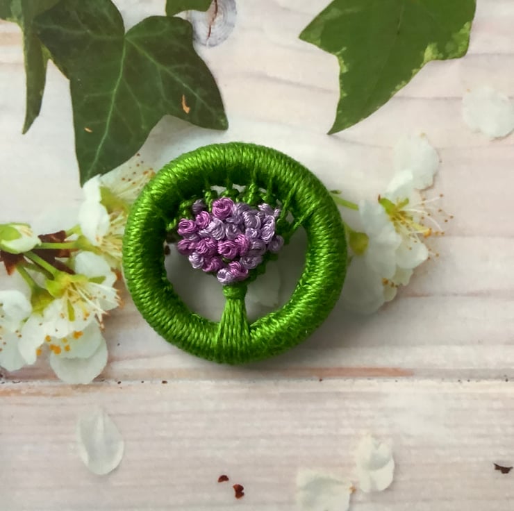 I have then embroidered french knots on it in two shades of purple it has a small brooch bar on the reverse with a safety catch for added security.