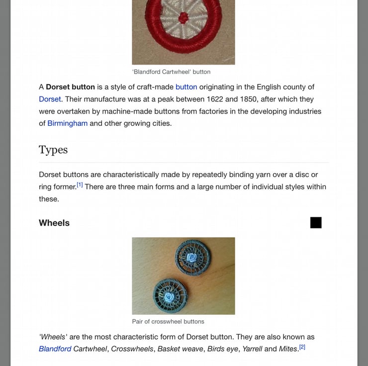 I have made this Dorset Button posy brooch using cotton thread on a plastic ring measuring approximately 4cm (1.5”) across.