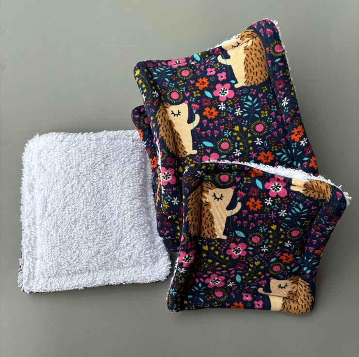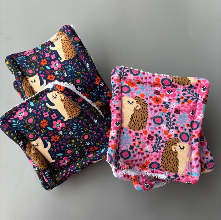 Cute hedgehog washable and reusable makeup remover pads. A great alternative to disposable face wipes or cotton wool pads, making a positive impact on our environment.