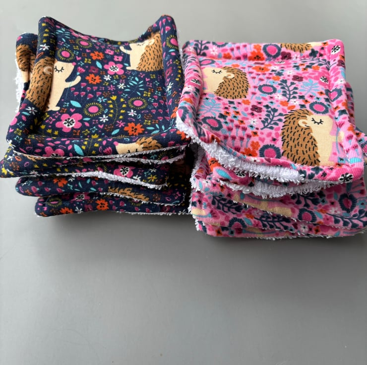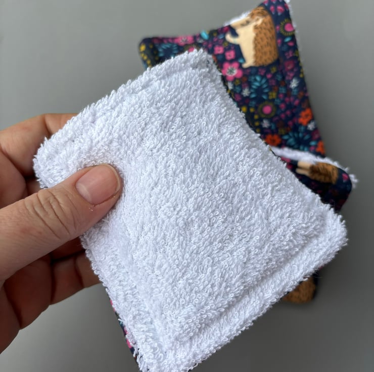 The pads have 3 layers, the cute soft cotton hedgehog, a layer of padding in the middle and 100% cotton towelling. The towelling is soft and ideal for sensitive skin and around the eye area.