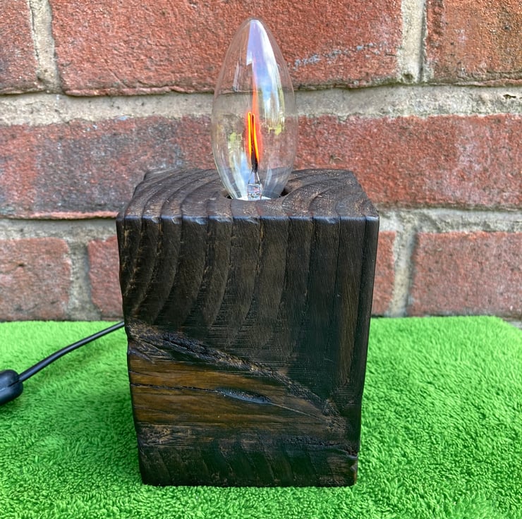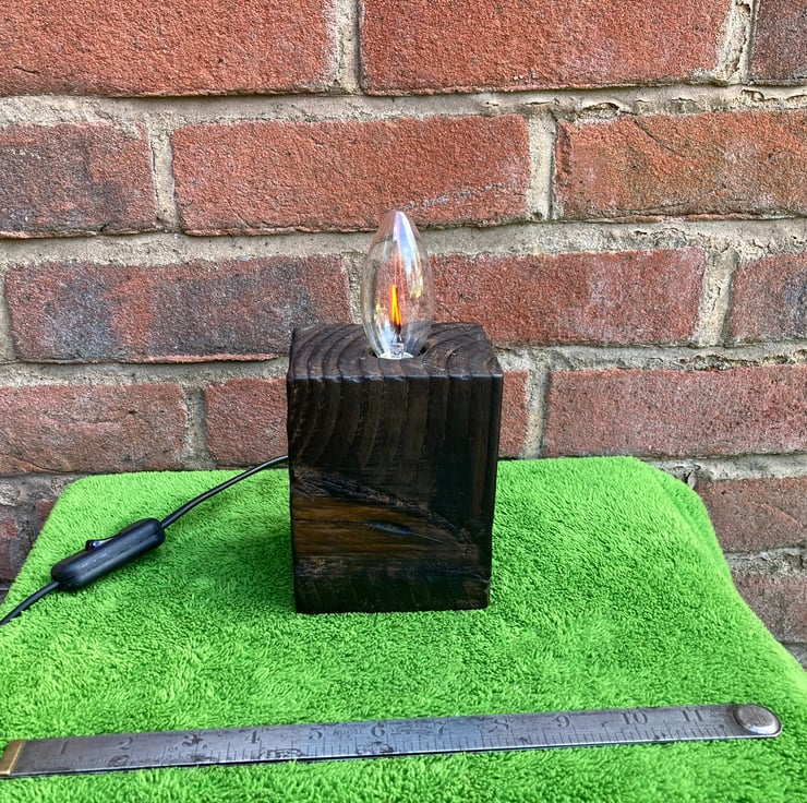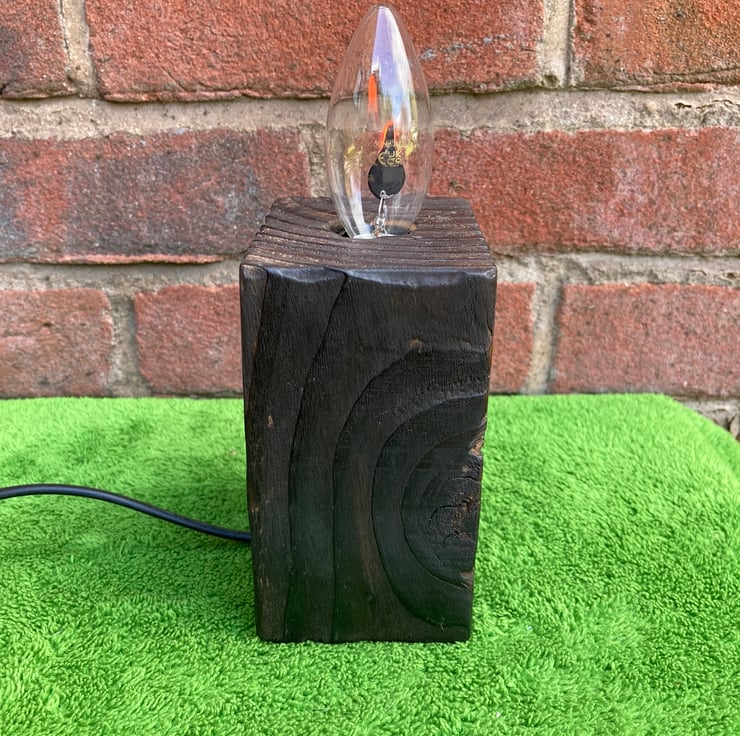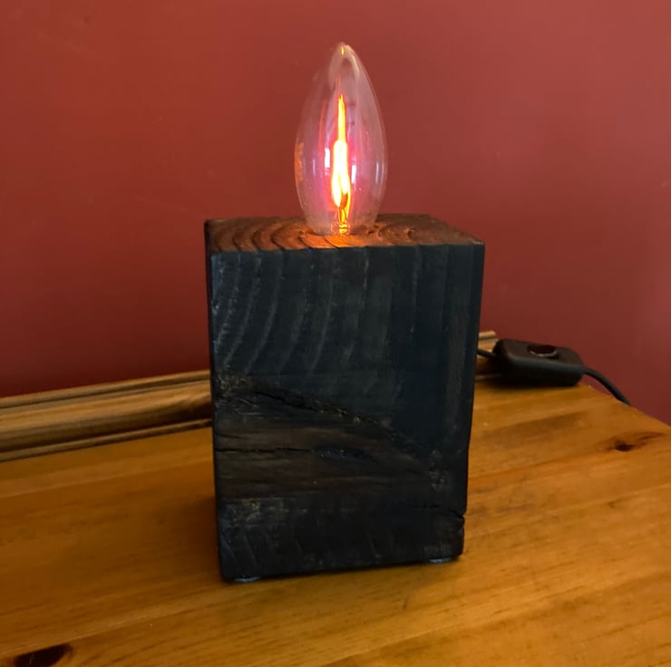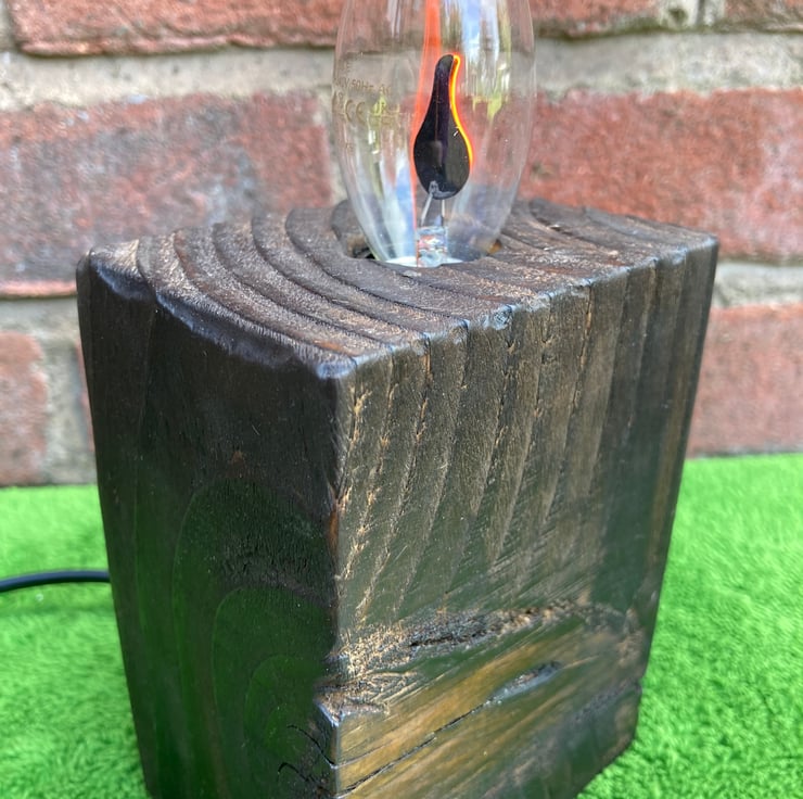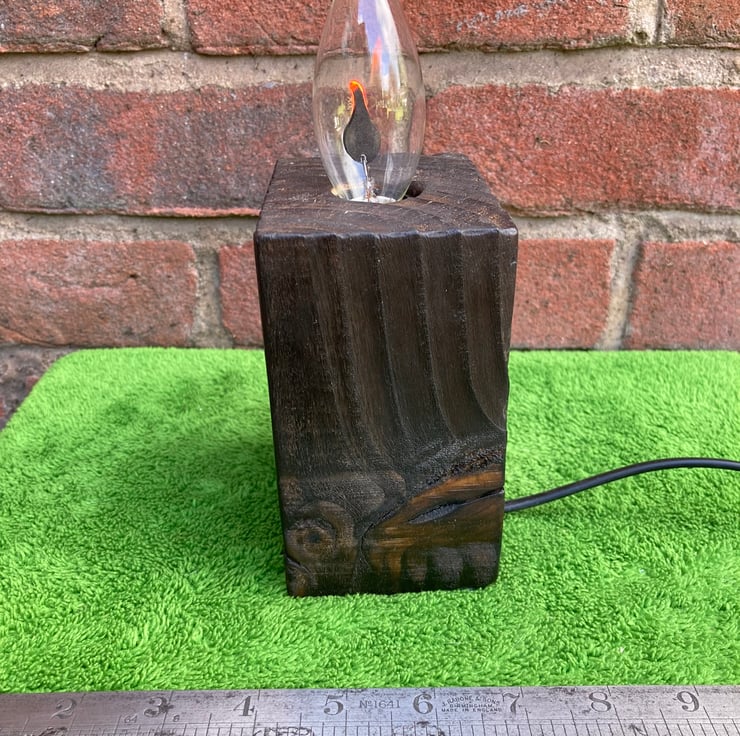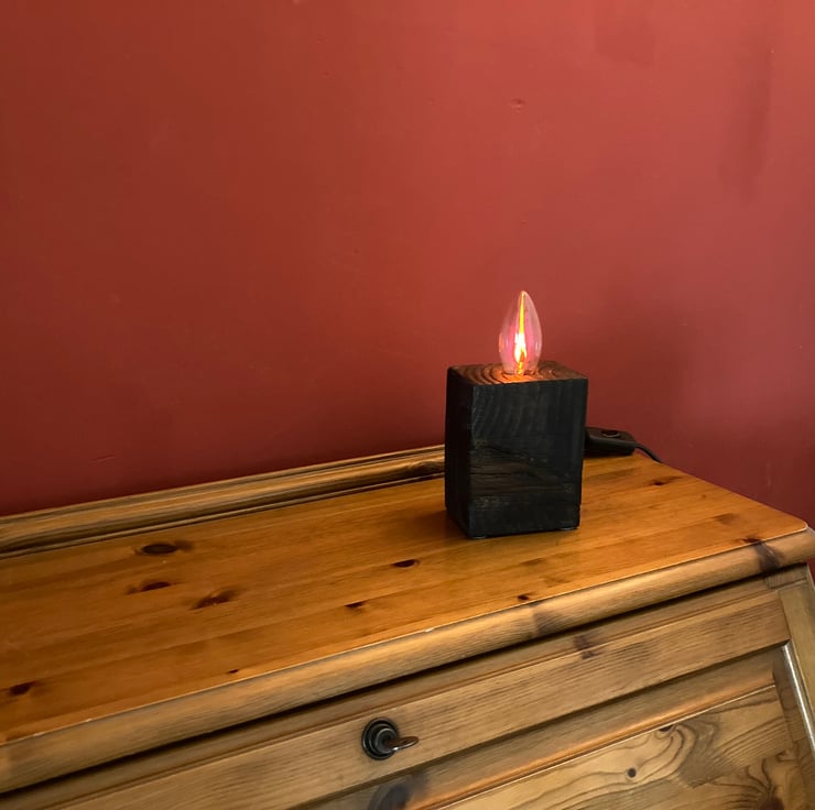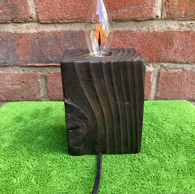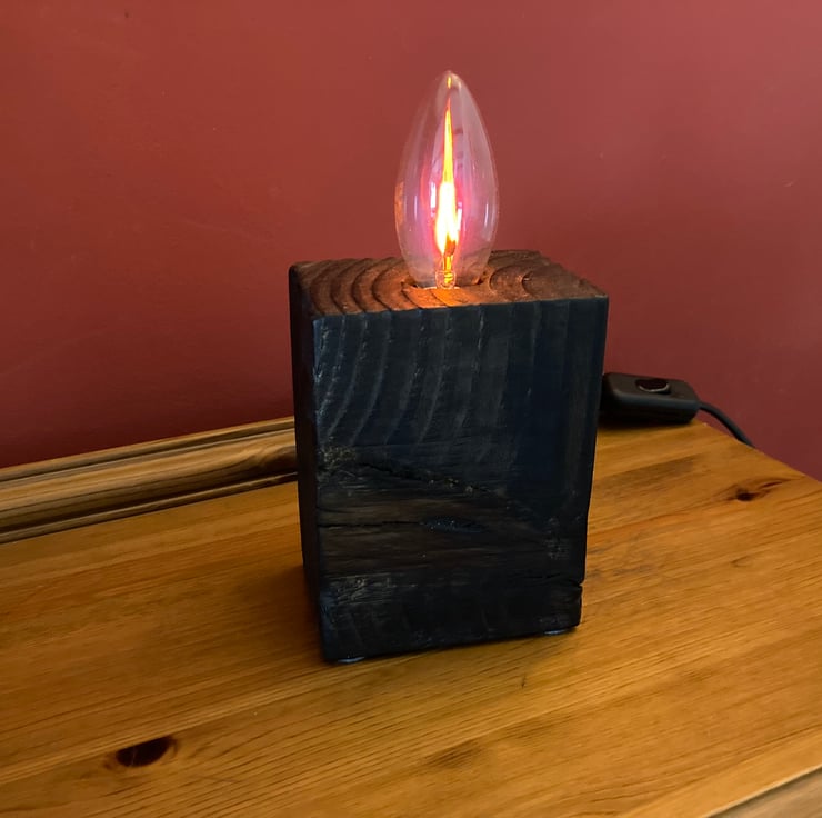 I have been experimenting with flamed finish wood and this little lamp is my third product using this technique, I think flickering flame effect bulb really suits it well too!