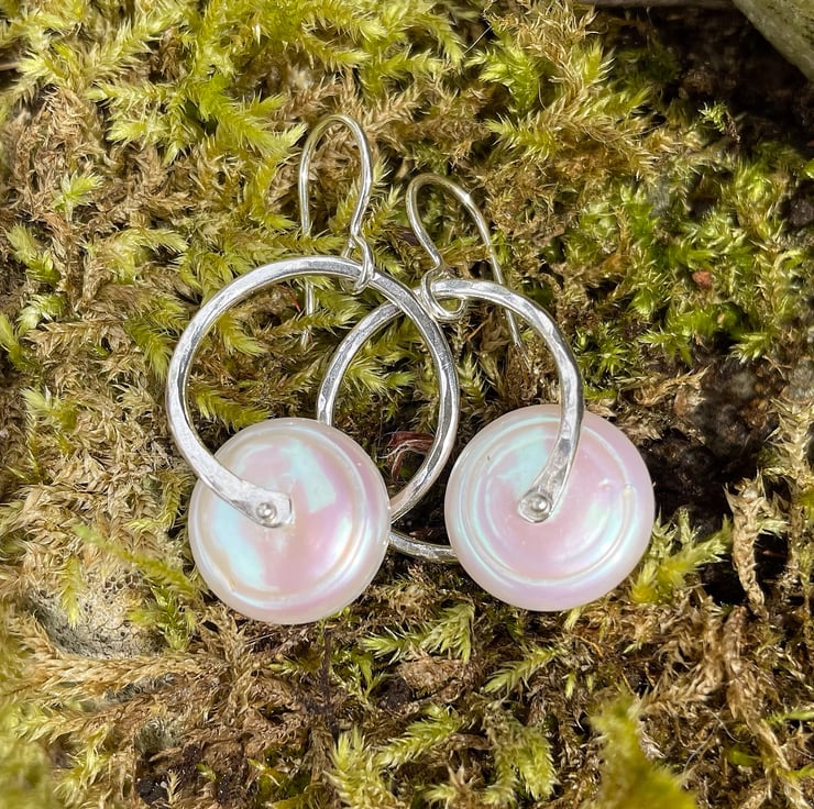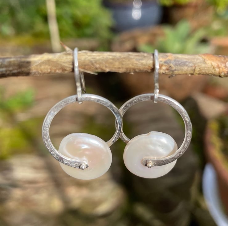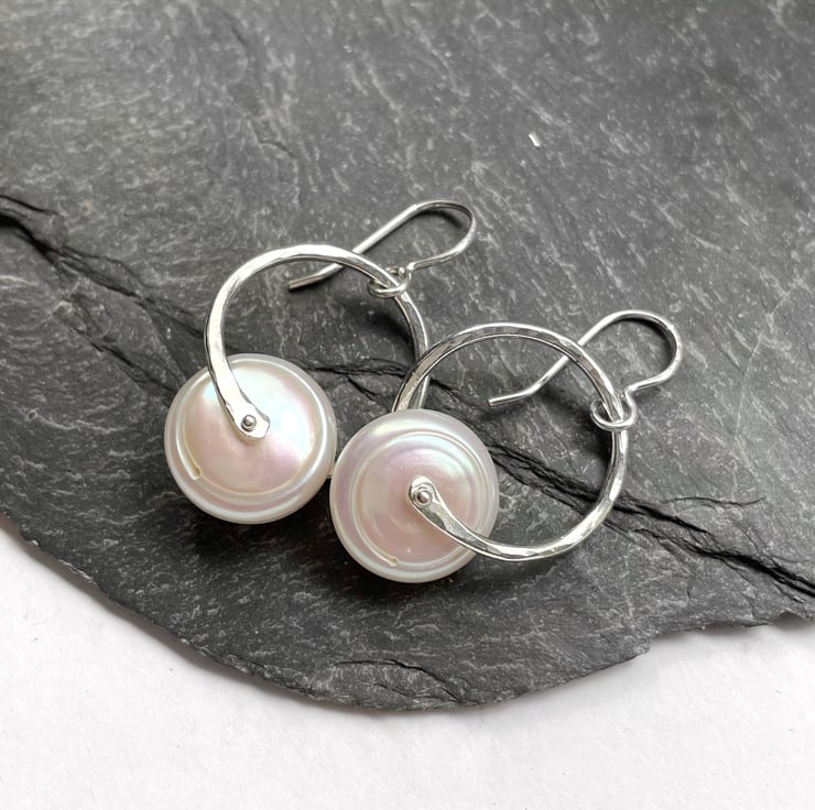 Large cultured white (with a pinky glow) freshwater pearl disc beads have been simply riveted in rings of textured silver and hung from handmade hook ear wires.