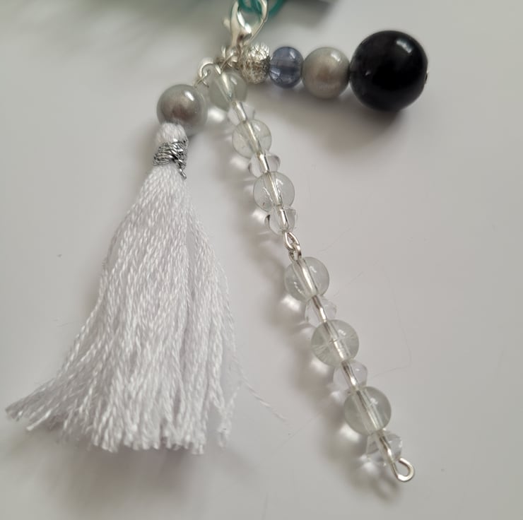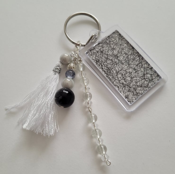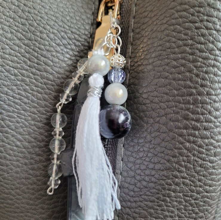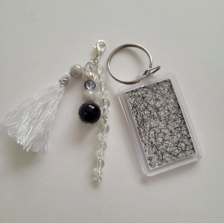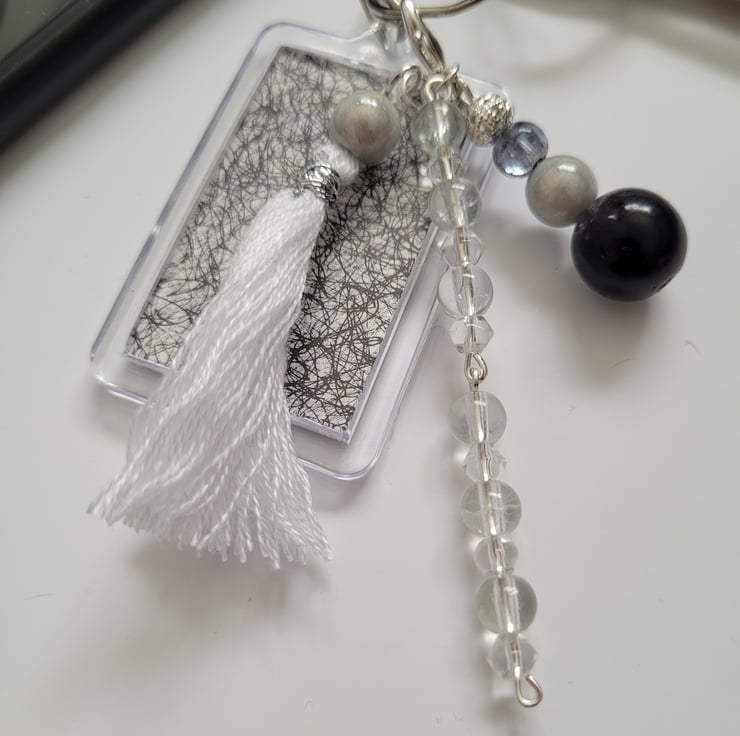 Handmade using a variety of clear, opaque, crackle and silver beads, silver plated headpins and claw clip and a white embroidery thread tassel. In addition to the charm, there is a keyring containing black and white texture effect picture visible on both sides. The charm and keyring are detachable from each other.