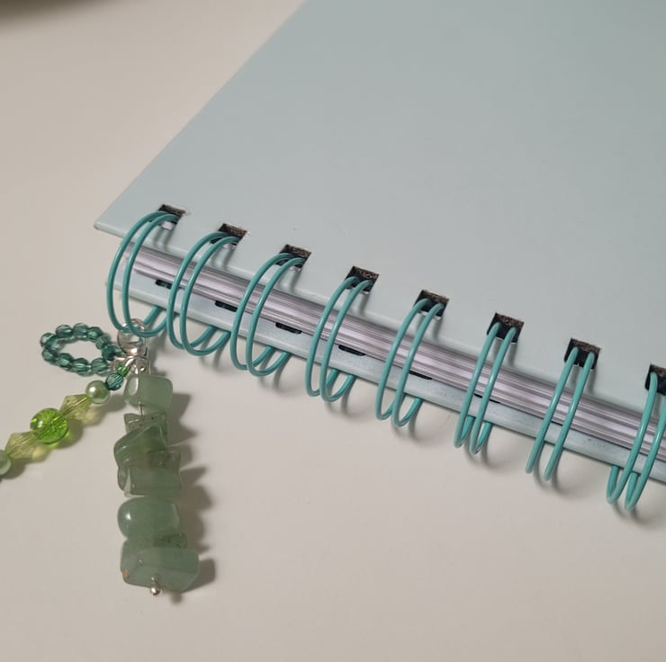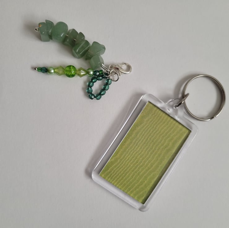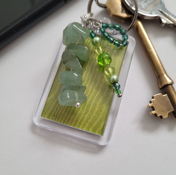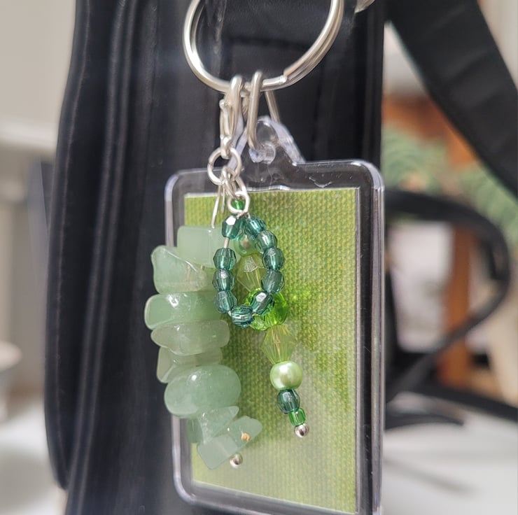Handmade using a variety of coloured, opaque, crackle, glass and seed beads, silver plated headpins and claw clip. In addition to the charm, there is a keyring containing a green texture effect picture visible on both sides. The charm and keyring are detachable from each other.