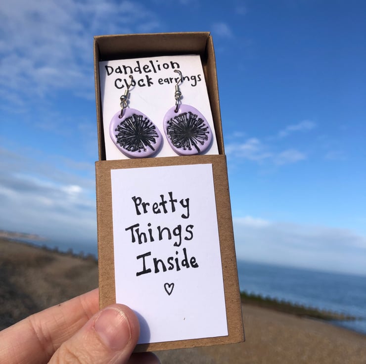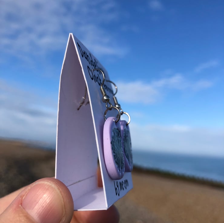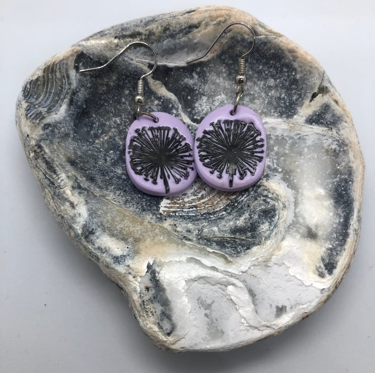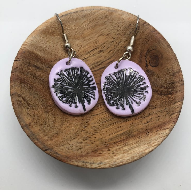 These silver plated earrings are made from polymer clay, inscribed with a dandelion clock design and varnished for extra durability and shine.