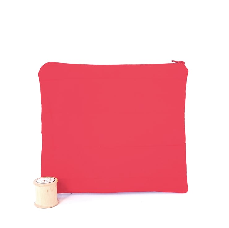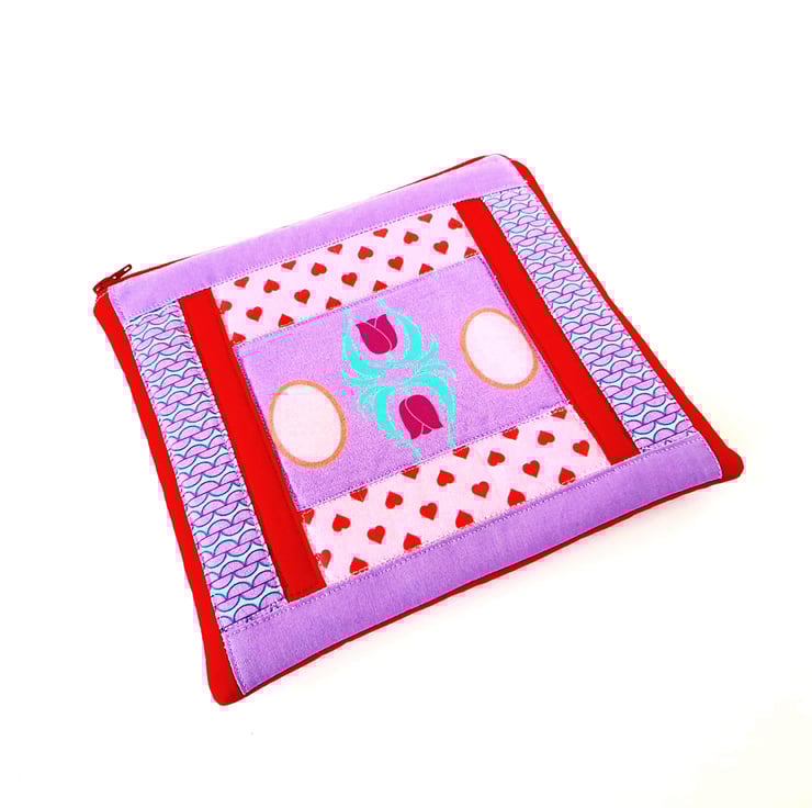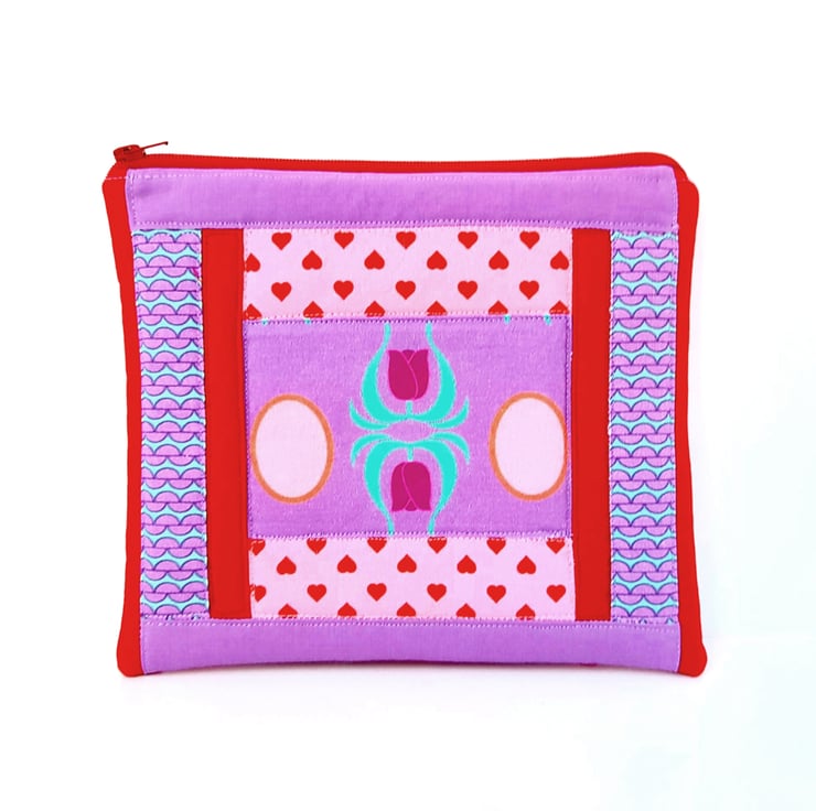 This is a lovely one off patchwork quilted zipper pouch which has been handmade using a variety of our own design 100% cotton fabrics and a plain red cotton.