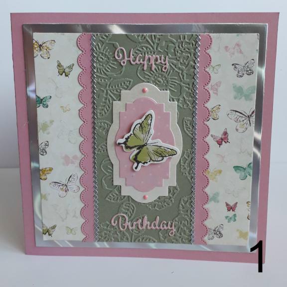 These 6 butterfly birthday cards are approximately 15cm/6" square, each one has a different butterfly on shaped toppers, I have placed them on an embossed card panel with a fancy border which matches the base card and a panel of butterfly or flower patterned paper to each side I have added a narrow gold or silver border strip over the join, there is a die cut "Happy Birthday" sentiment to match.