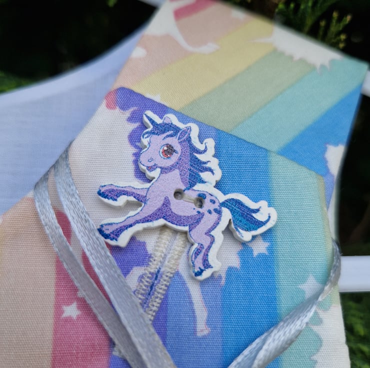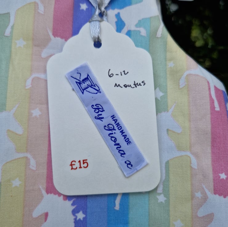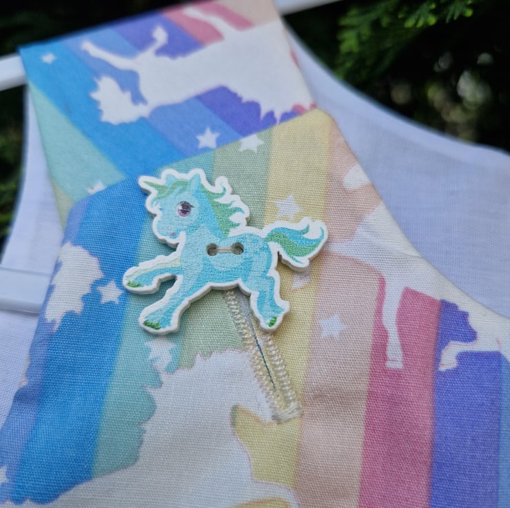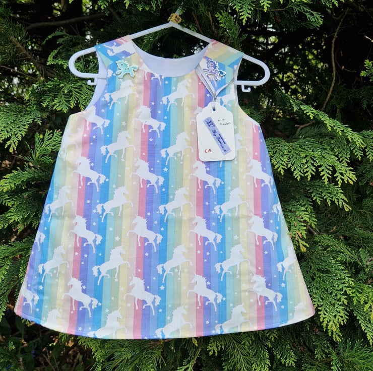 A fully lined pinafore A-line dress made from a pale rainbow printed cotton with white unicorns and stars and with wooden unicorn shaped buttons. It can be worn as it is, or with a long or short sleeve T shirt underneath and cardigan on top on cooler days.