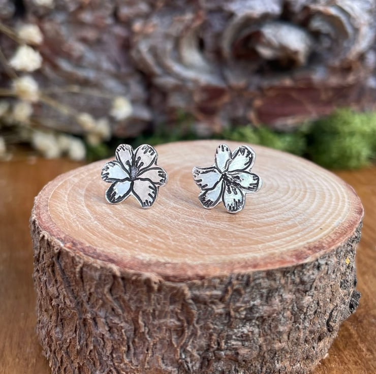 These floral inspired stud earrings feature the outline of a blossom flower and are oxidised to pick out the detail.
