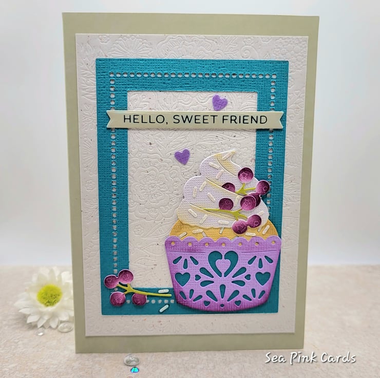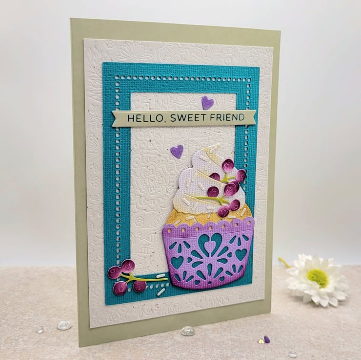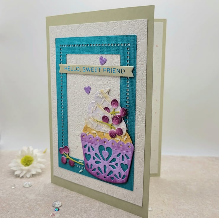 Measuring 10.5 x 14.75 cms, the card comes supplied with a coloured quality lined envelope. This detailed card is individually made by hand in my craftroom. The card base is light pebble grey and has a textured debossed natural flecked layer. I have die-cut a fabulous cupcake and berries and layered this on top of a die-cut frame. Inks used are archival and non-toxic and all materials used in this friend greeting card are high quality.