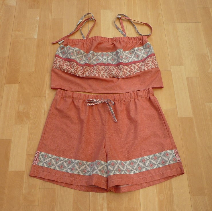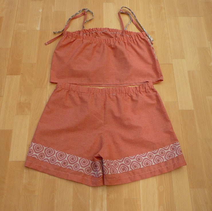 The pyjamas are shorts and a camisole top, the shorts are pull on and have an elasticated waist with an added draw string for a comfortable fit and side pockets
