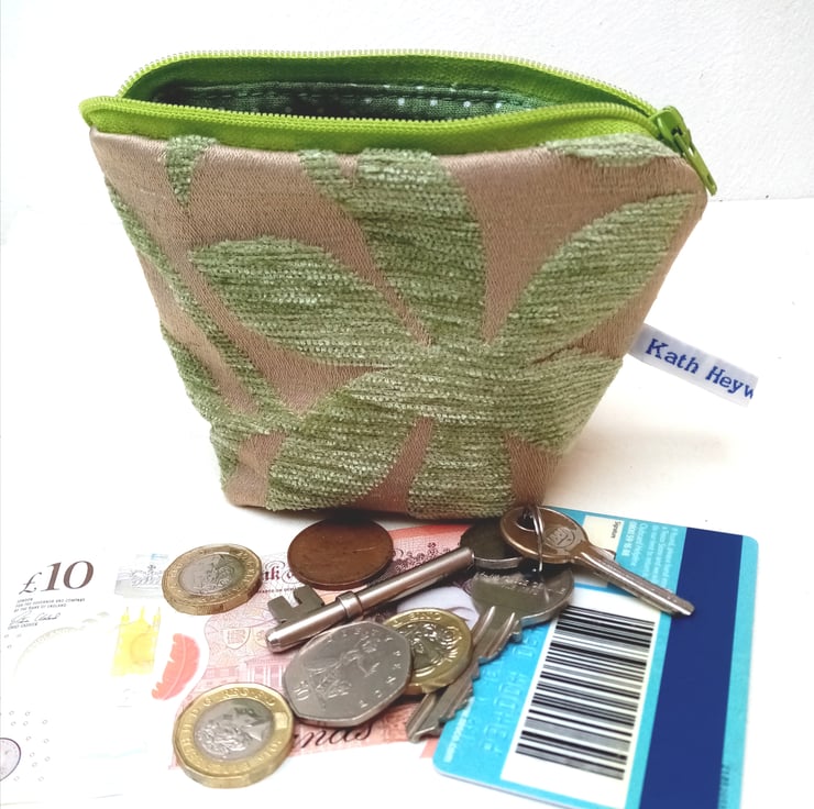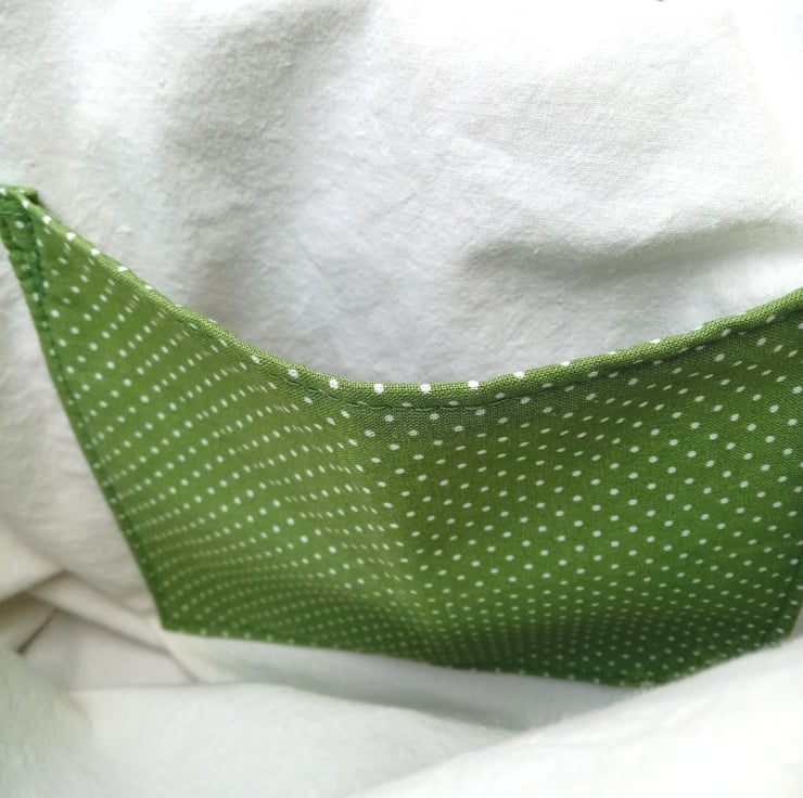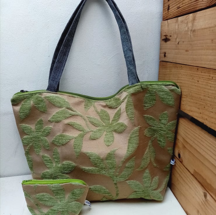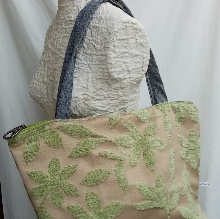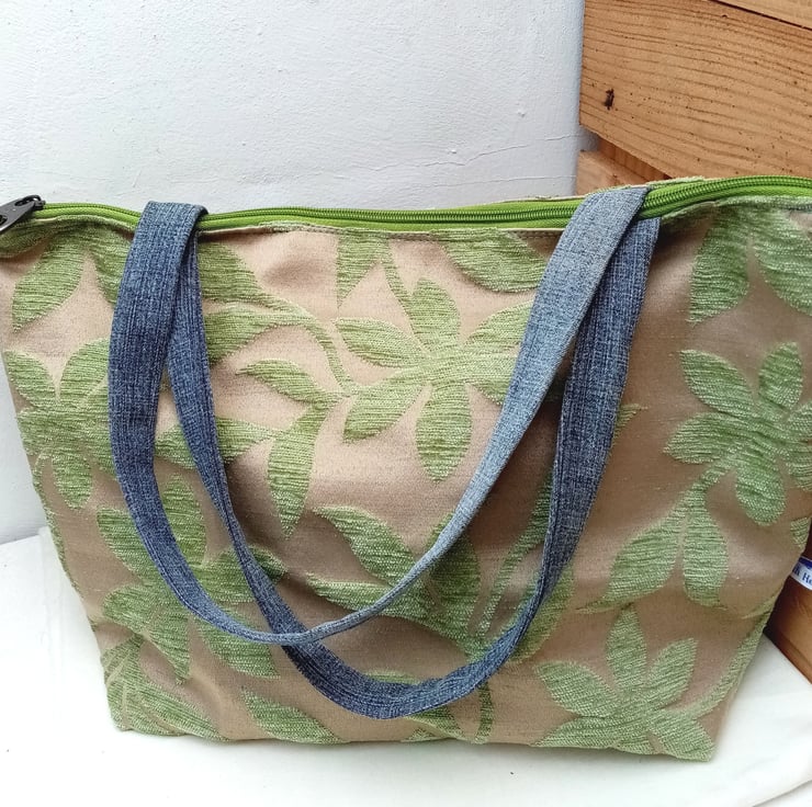 A fabulous, zipped, soft structured bag, handmade from a gorgeous leaf design upholstery fabric, and lined with a contrasting cream calico fabric. The lining has a green patch pocket, handy for a phone. The handles are made from up-cycled blue denim and long enough to carry over the shoulder or in the hand. The salvaged green zip keeps your items in the bag secure.