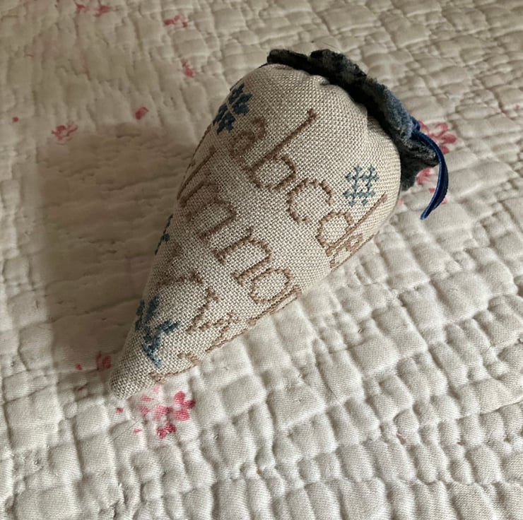 A gorgeous cross stitch alphabet sampler, stitched in 3 muted tones of stranded cotton, on even weave linen.