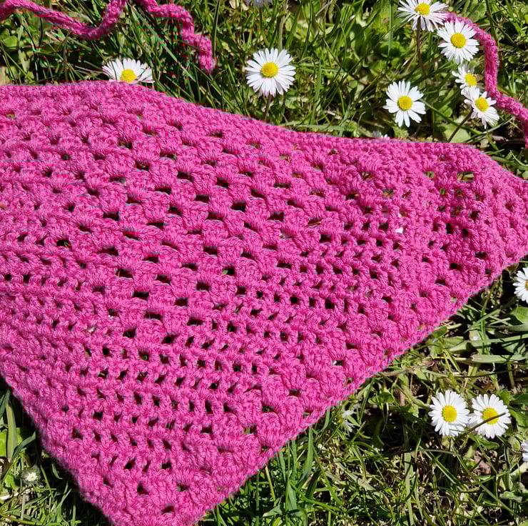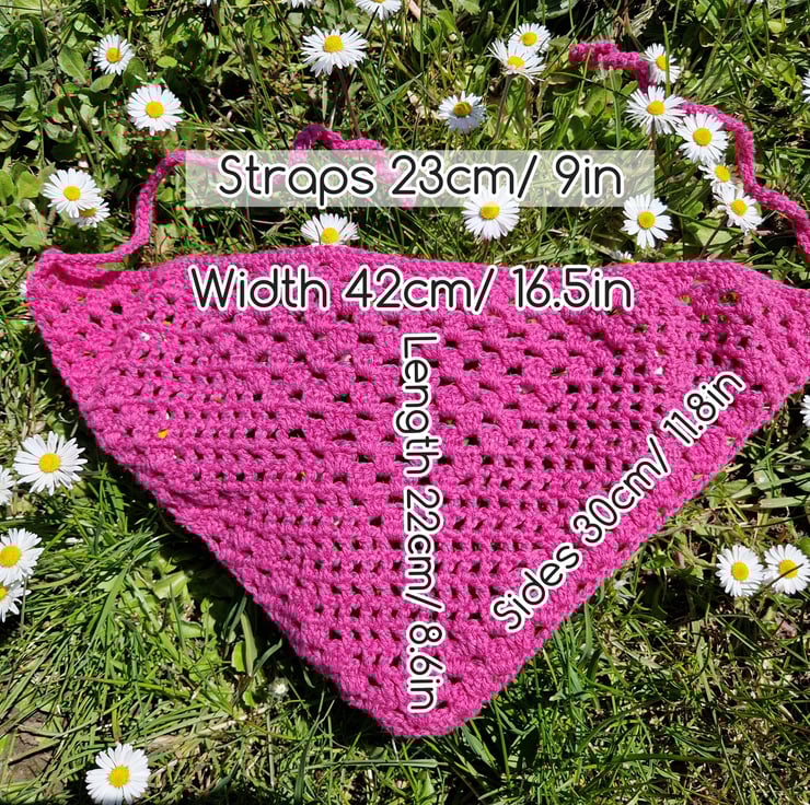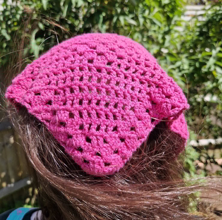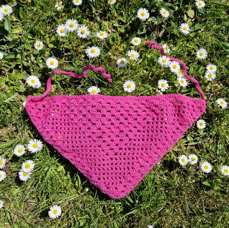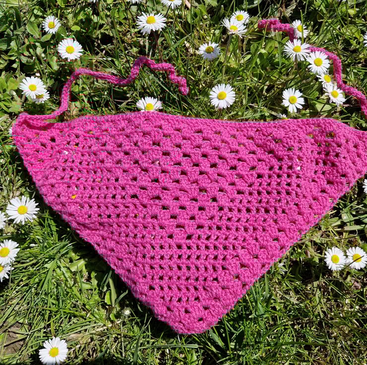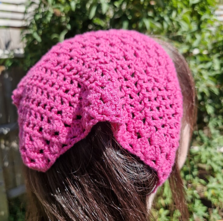 A hot pink crochet bandana, the perfect summery hair accessory! Handmade with a blend of bamboo and cotton yarn making it lightweight, soft and colourful.