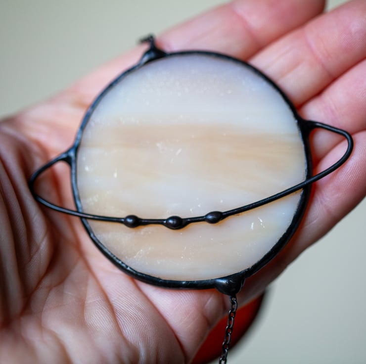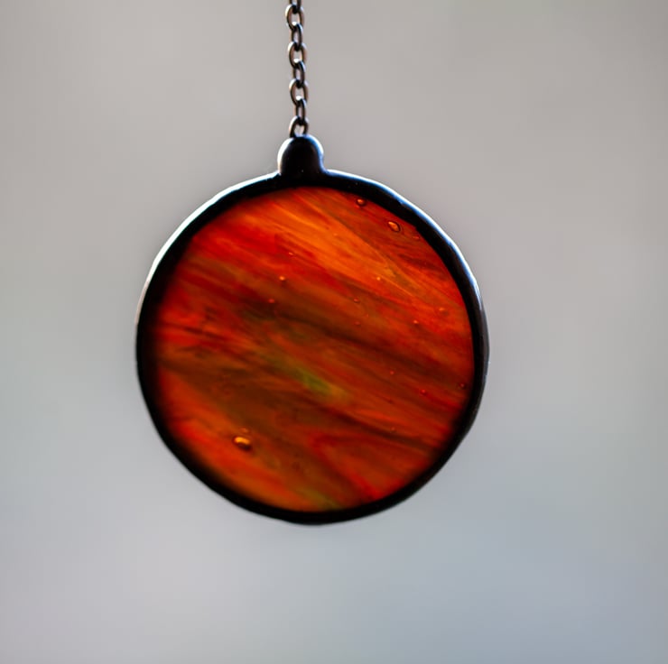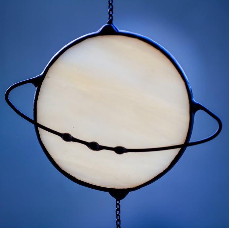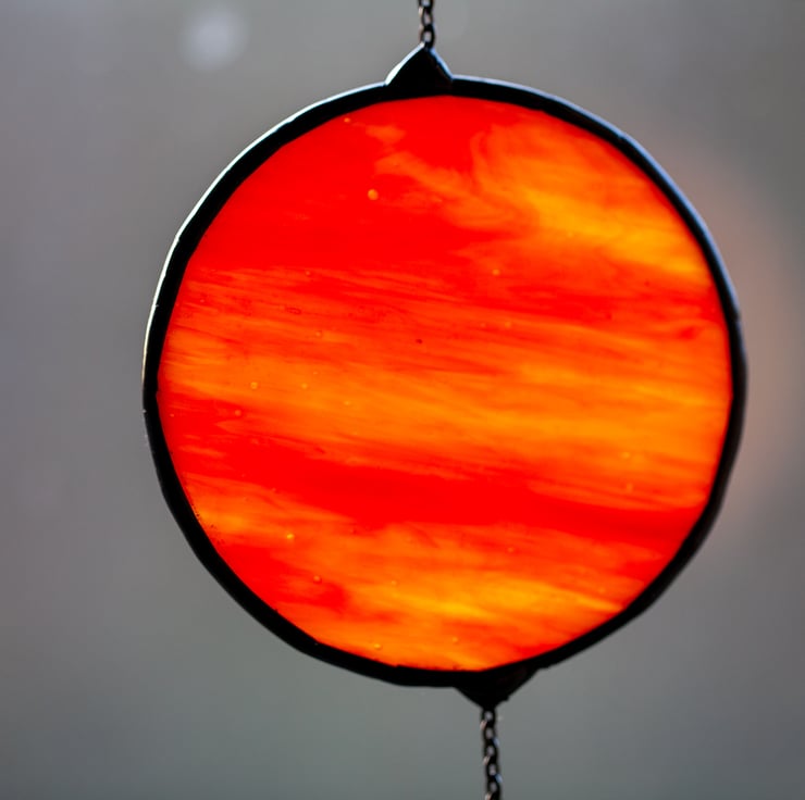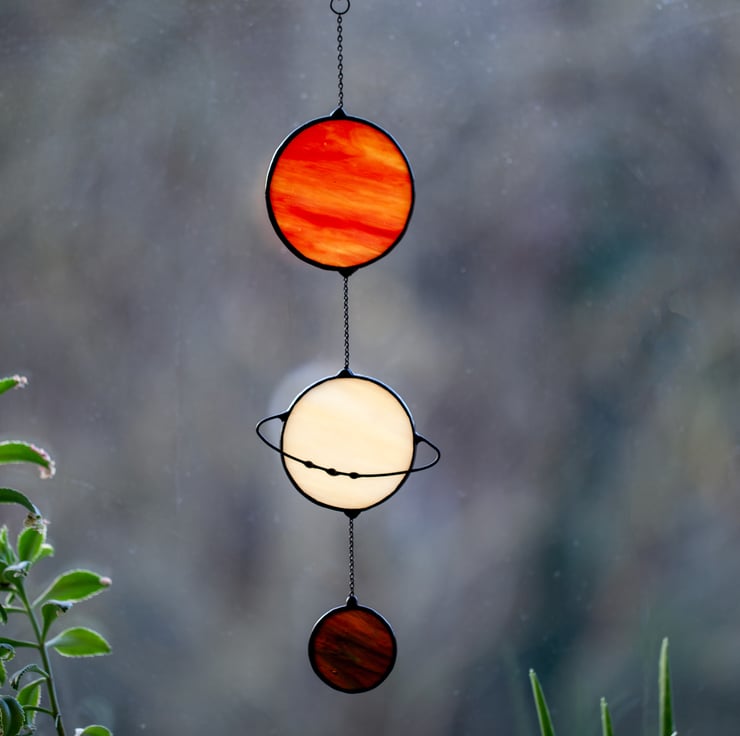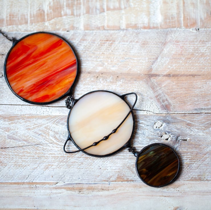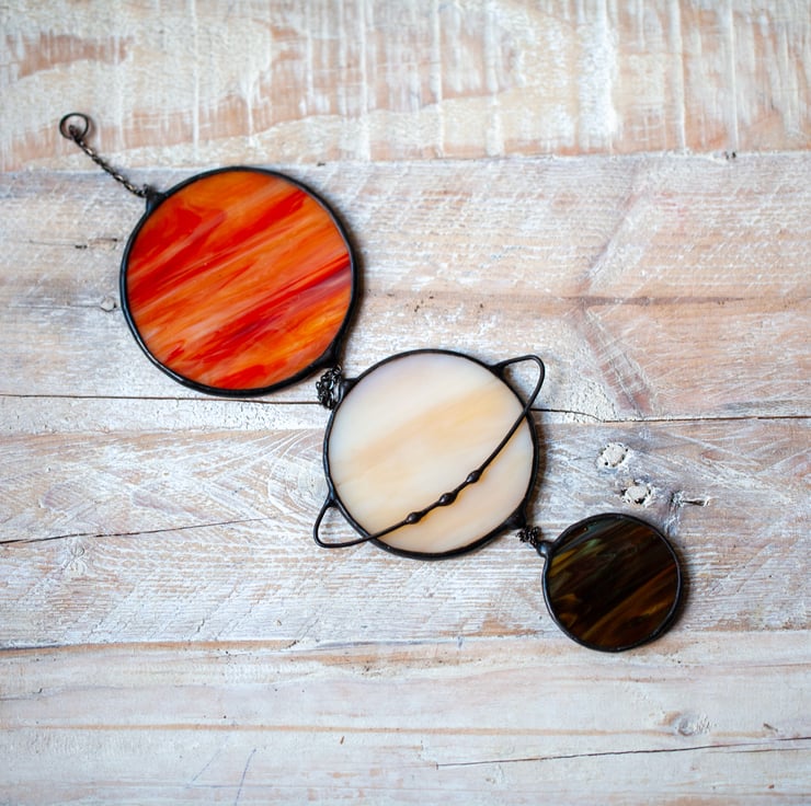 Beautiful stained glass suncatcher. Planets made of opalescent glass (a type of glass you cannot see through) in vivid colours, finished in black patina. Planets are 7cm, 6cm, 4cm in diameter. It's 30cm long including the chain.