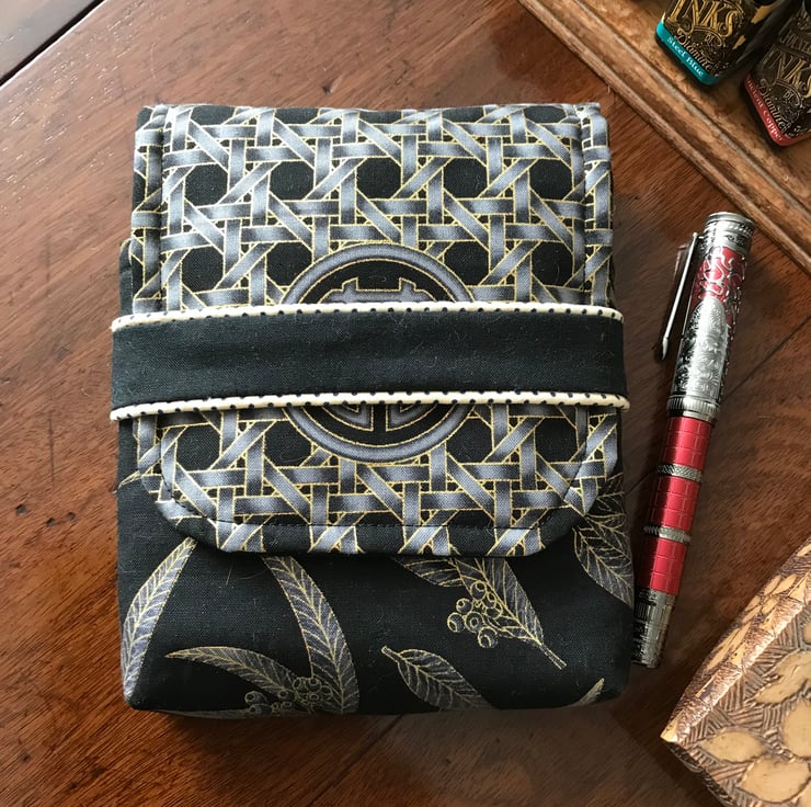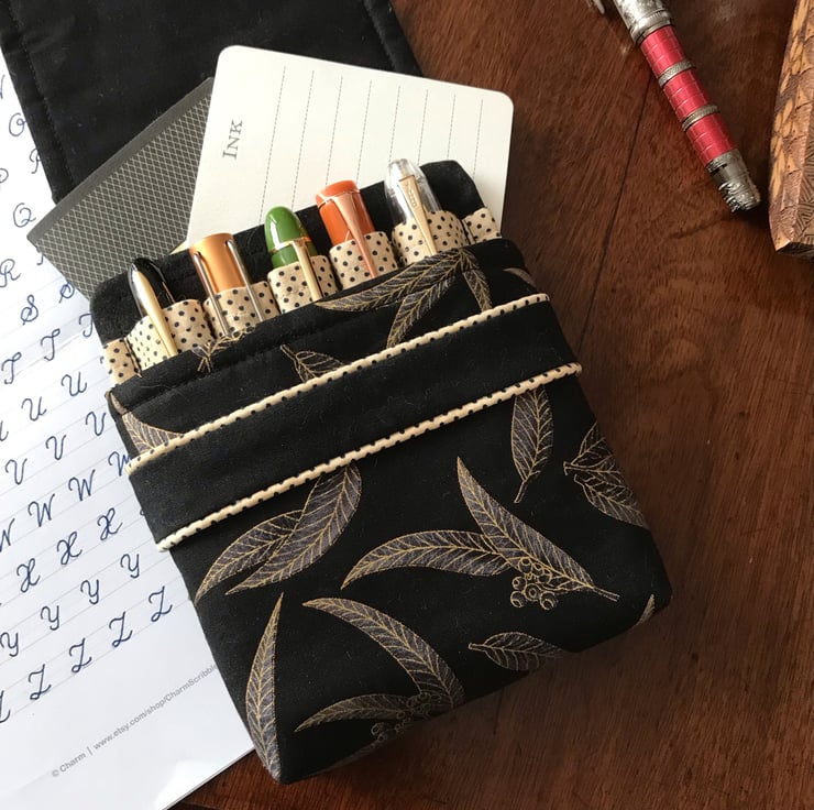 The outer, padded case contains a removable stiffened insert with fabric loops to hold, separate and protect the pens. All visible fabrics are 100% cotton. Three types of interlining provide cushioning, support and stability. The pen slots are 10 cm long so give excellent protection and will house all but the chunkiest of pens, while the tuck-under outer flap adjusts to accommodate extra-long pens. There is space behind the insert in which to tuck a note of pens and inks, plus a small slim notebook. Only a very limited number of each case will be made.