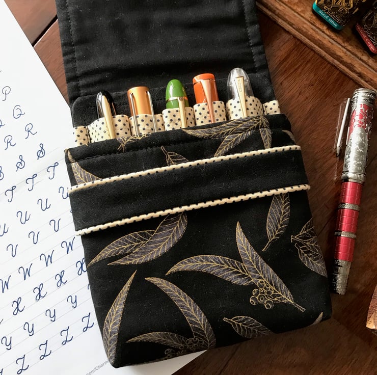 The outer, padded case contains a removable stiffened insert with fabric loops to hold, separate and protect the pens. All visible fabrics are 100% cotton. Three types of interlining provide cushioning, support and stability. The pen slots are 10 cm long so give excellent protection and will house all but the chunkiest of pens, while the tuck-under outer flap adjusts to accommodate extra-long pens. There is space behind the insert in which to tuck a note of pens and inks, plus a small slim notebook. Only a very limited number of each case will be made.