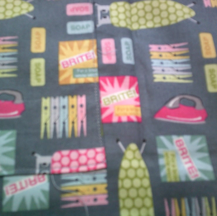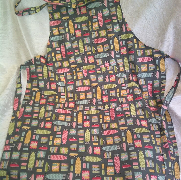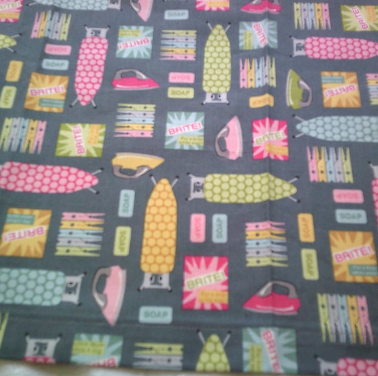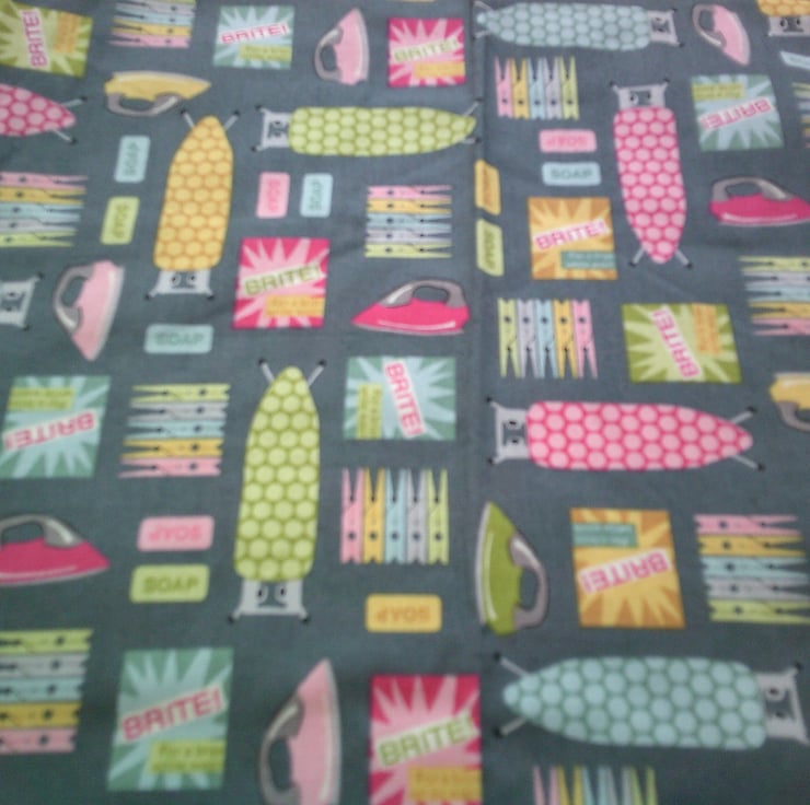 The design of the fabric used for this apron is of colourful ironing boards, irons, boxes of washing powder and clothes pegs o a grey background.
