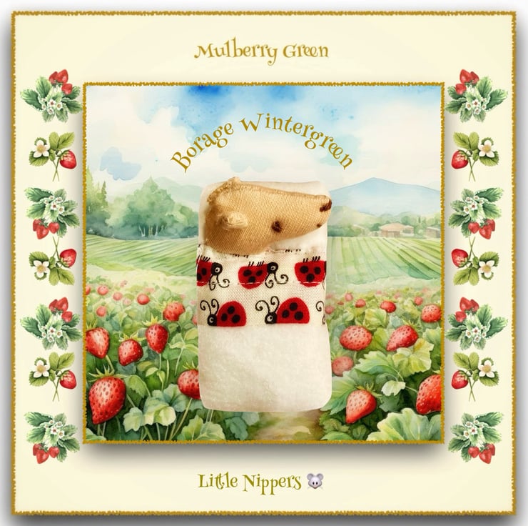 Borage Wintergreen, in her cosy cream sleeping bag with ladybird trim, is a Little Nipper baby mouse - tiny mice who live in a maze of tunnels underneath the barn at Mulberry Farm. All of the Little Nippers are named after herbs or meadow flowers. Pip Squeaks are very tiny and are not removable from their sleeping bags.