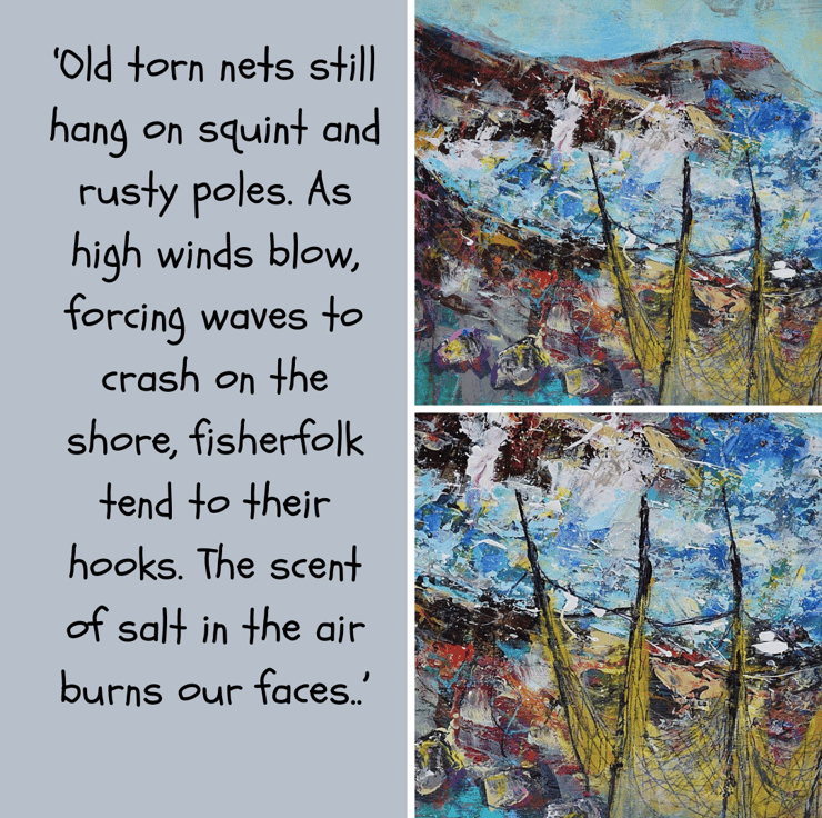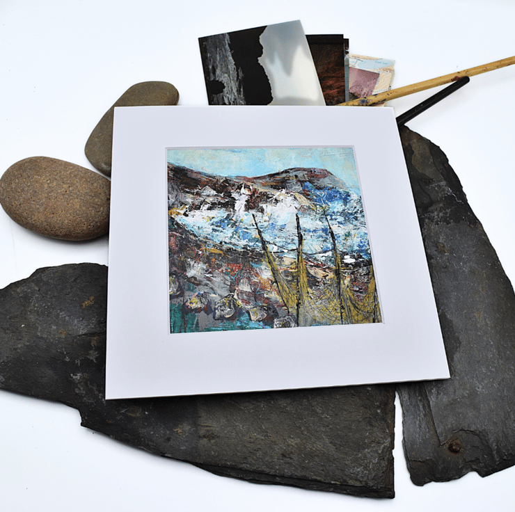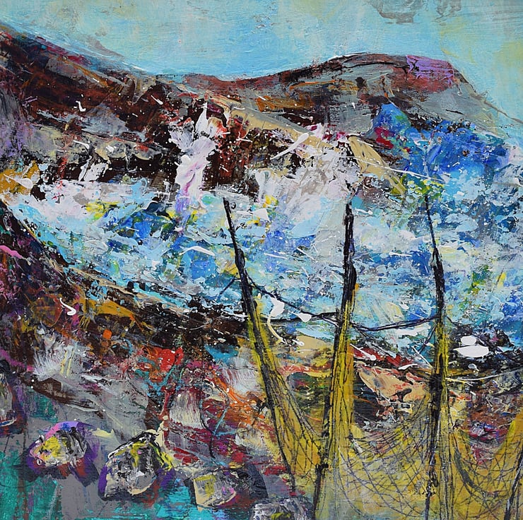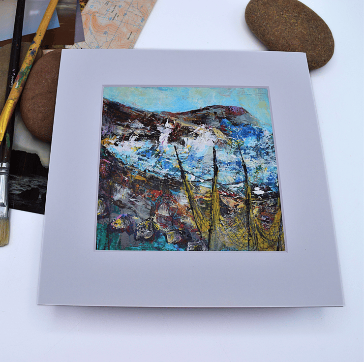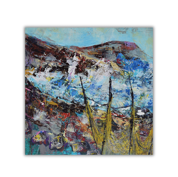 This mounted, coastal landscape painting is full of vibrant colours and textured brushstrokes. The acrylic painting depicts a stormy sea with fishing nets in the foreground. I have used layers of acrylic paint and scratched into the surface with a mixture of pastels, pencils and marking tools.