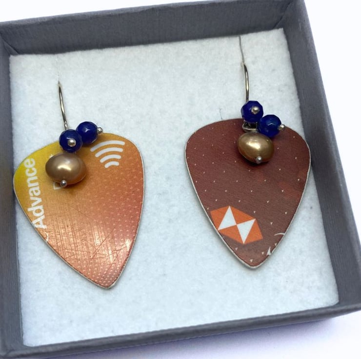 These one of a kind earrings are made from recycled bank cards cut into plectrums, with gold toned freshwater pearls and diddy sapphires.