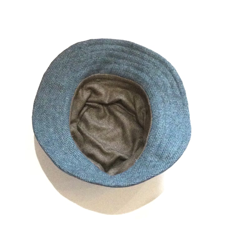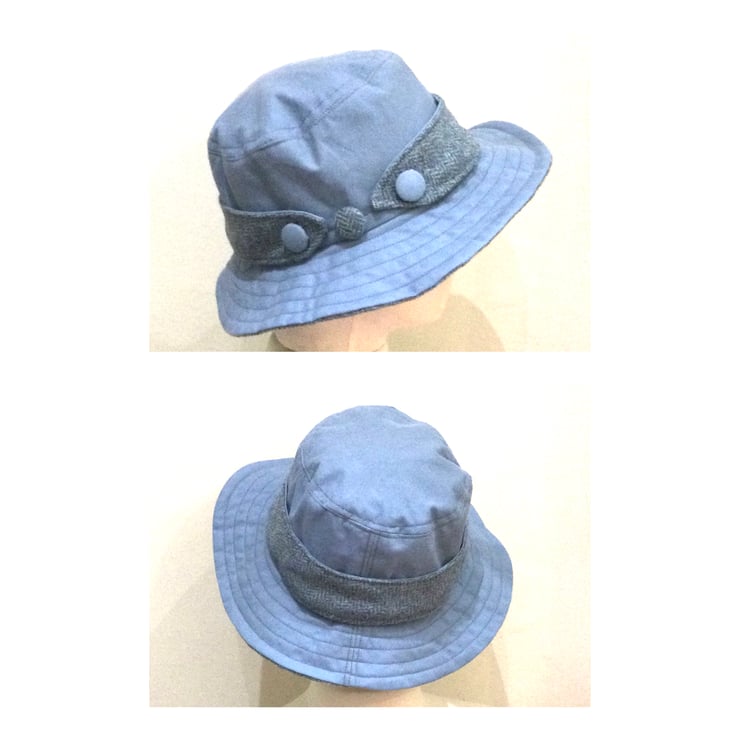 Waxed cotton hat with wool trim. Warm lined. Made to fit a medium head size 22.5”.