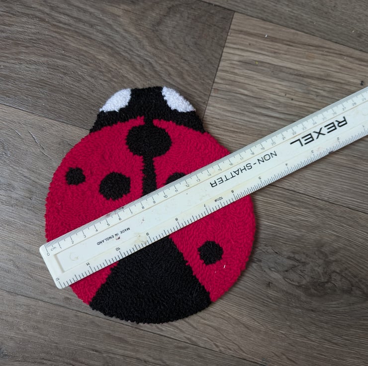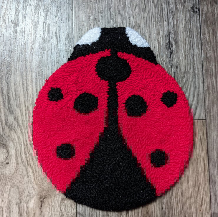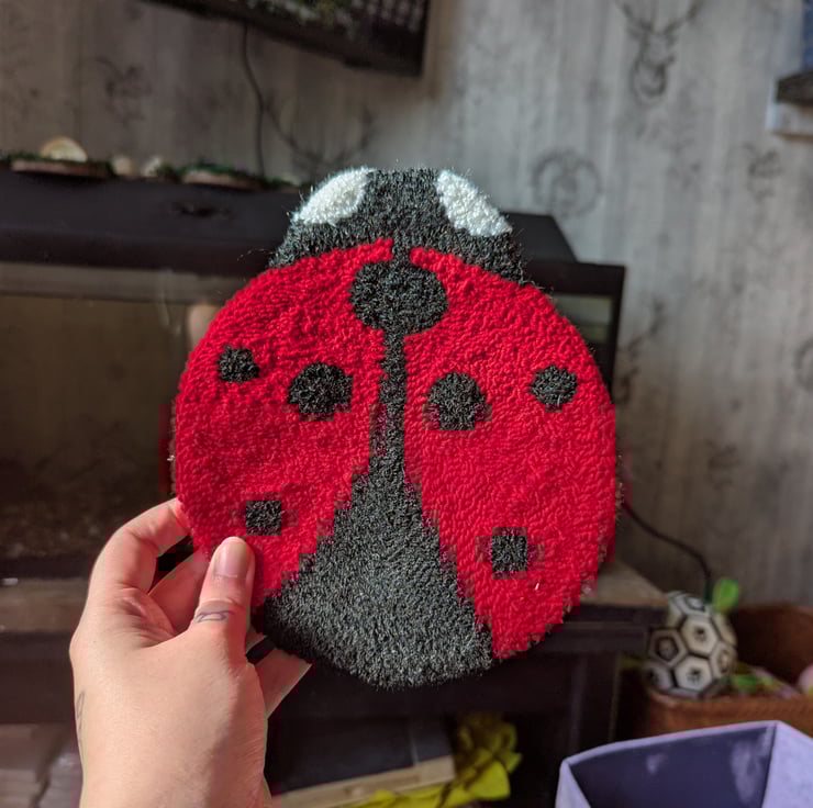 A handmade, needle punched mug rug, coaster or general decoration, made from acrylic yarn with a black felt backing.