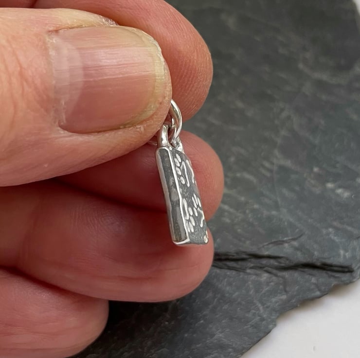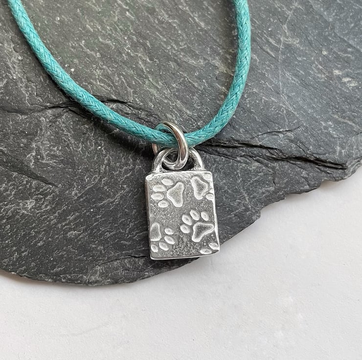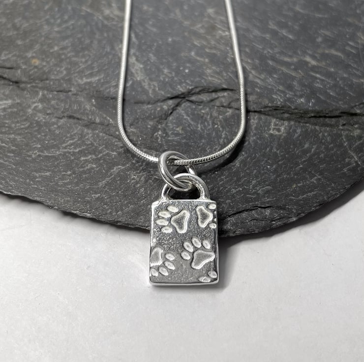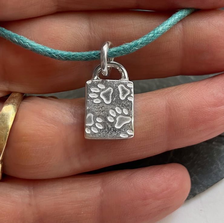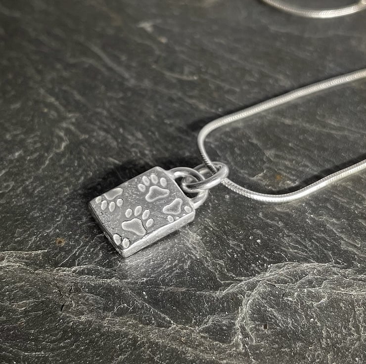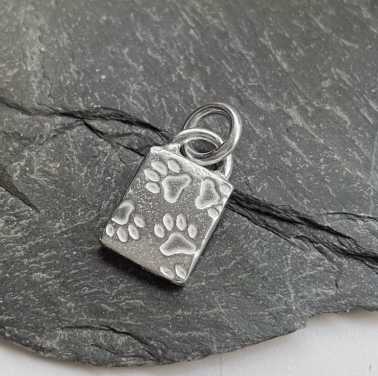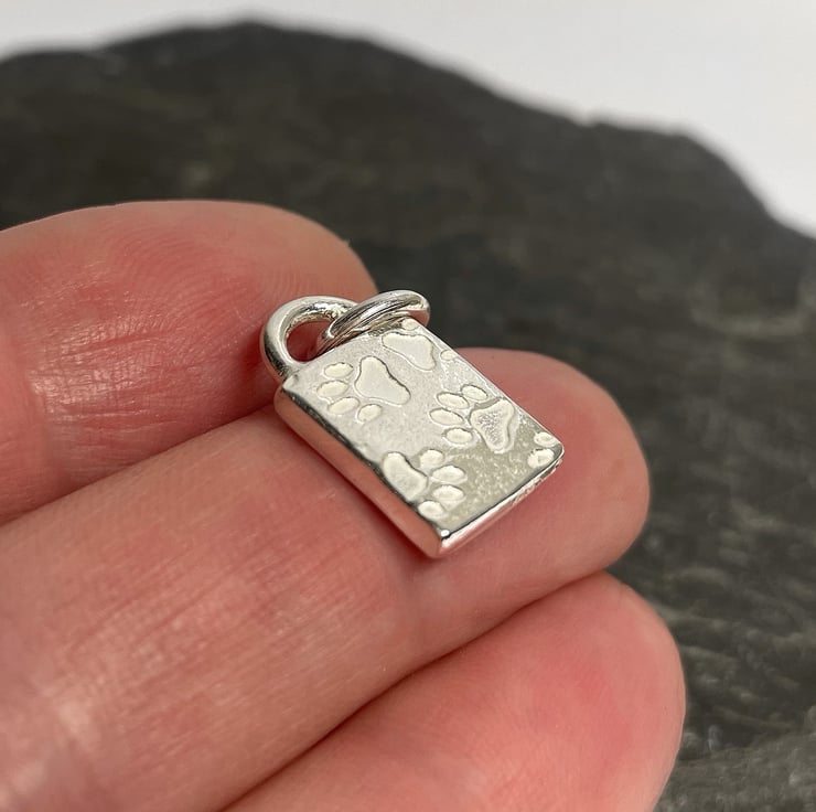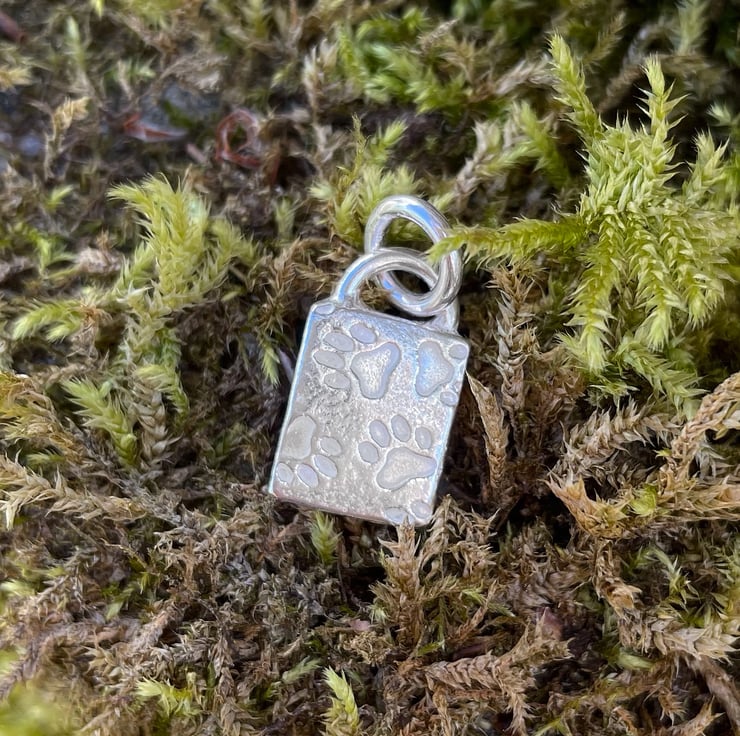 I have embossed paw prints onto a rectangle of thick silver, and added substantial jump ring and bail.