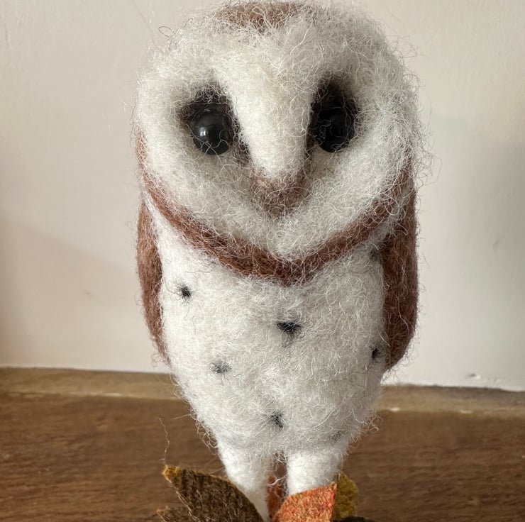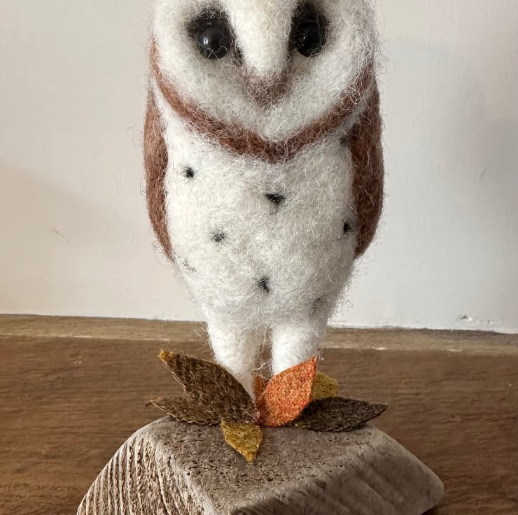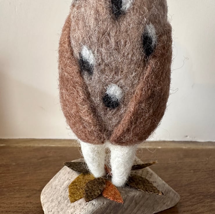 Needle felted wool with bead eyes and wool covered wire legs attached to a piece of driftwood adorned with tweed leaves