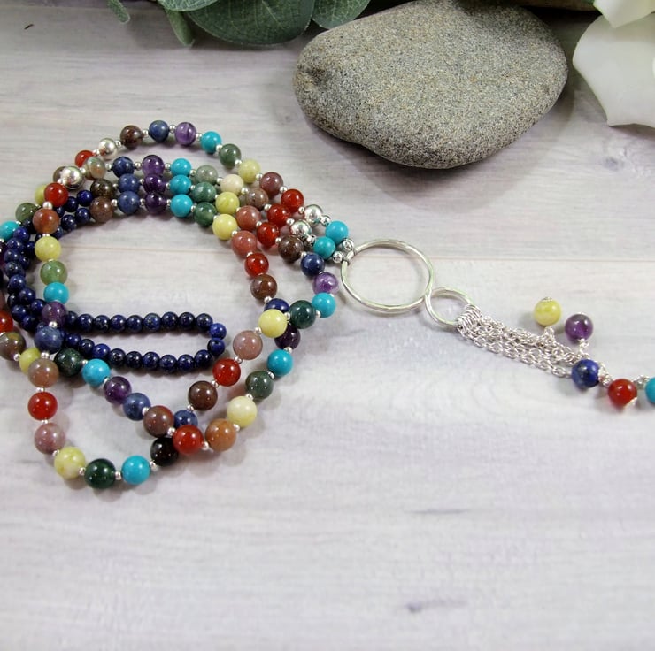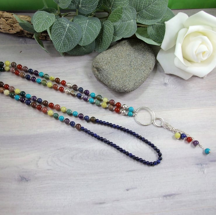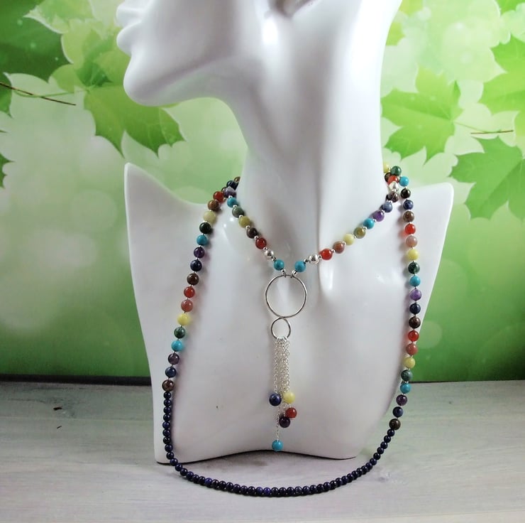 Long Rainbow Mixed Gemstone Necklace with Sterling Silver Focal and Accents. Mixed Gemstones of 3mm lapis lazuli with 6mm agates, turquoise, carnelian, jade, amethyst and sodalite paired with a silver infinity knot, chains and spacer beads. Necklace is 30 inches long wit no clasp.