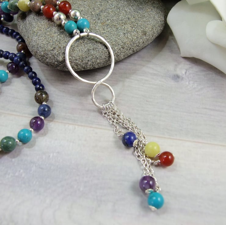 I have made the silver shape with 1.5mm sterling silver wire shaped by hand and soldered together. The beads have been threaded by hand on waxed cord with finishing touch of lengths of chain with gemstone beads.