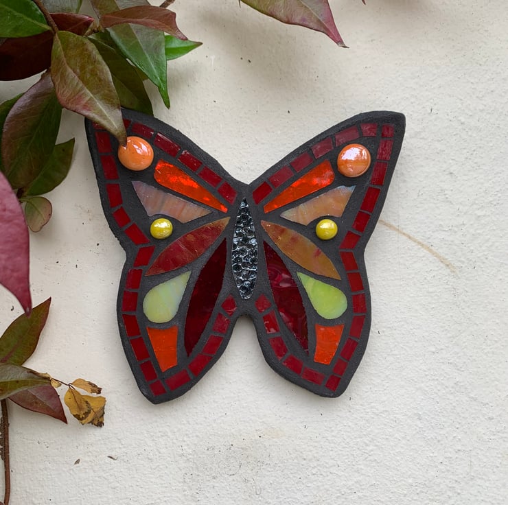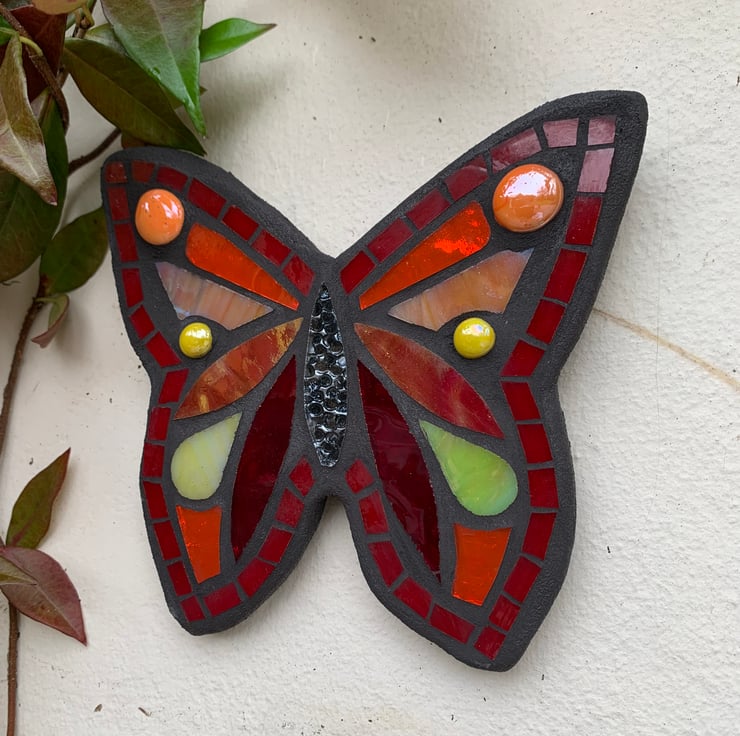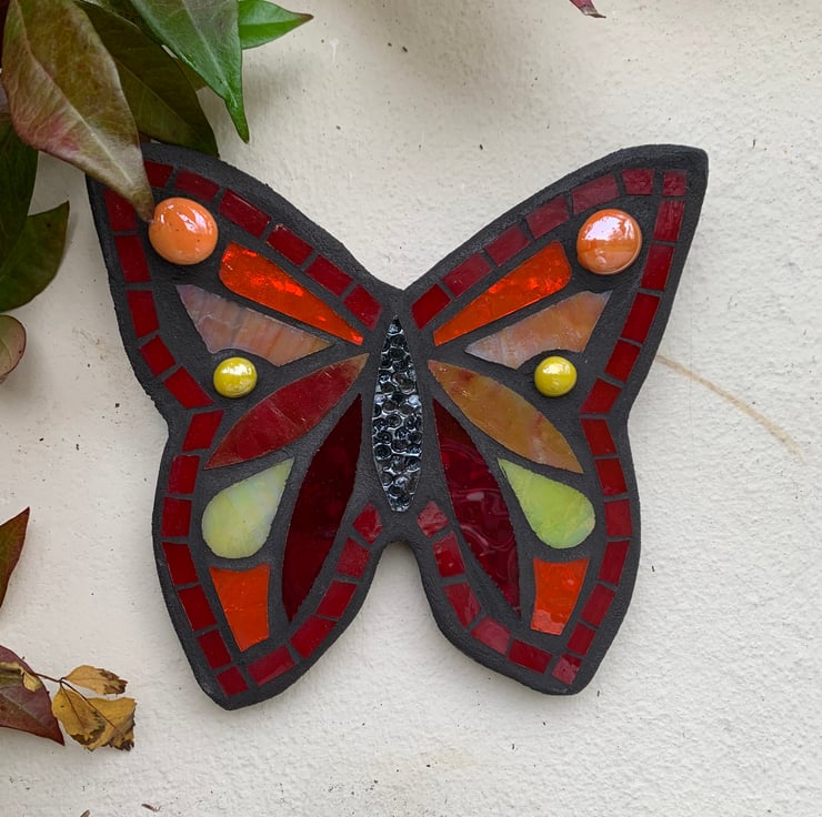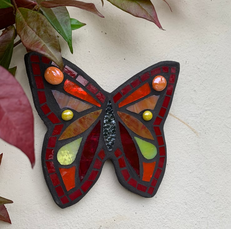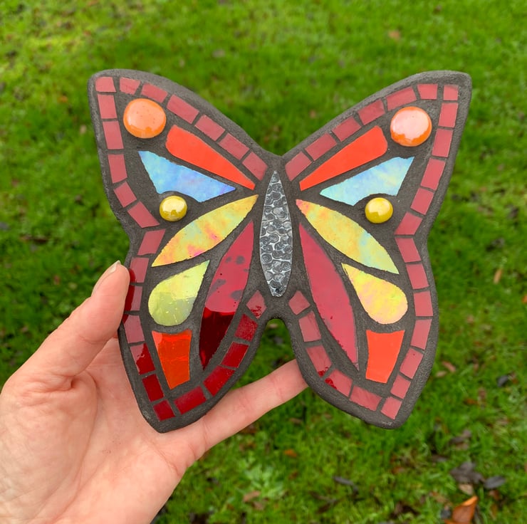 This beautiful stained glass butterfly has been handmade from start to finish from the cutting of the tile board to form the butterfly shape to each individual hand cut piece of glass and then the final grout to finish.