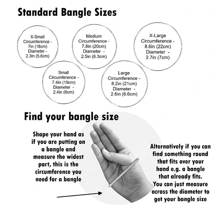 To check your bangle size just tuck your thumb in and measure around the widest part of your hand just below your knuckles. If you don't have a flexible tape you can use a strip of paper, mark for your size and then measure the paper against a ruler. See size guide photo.