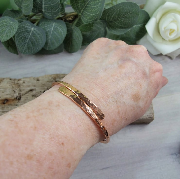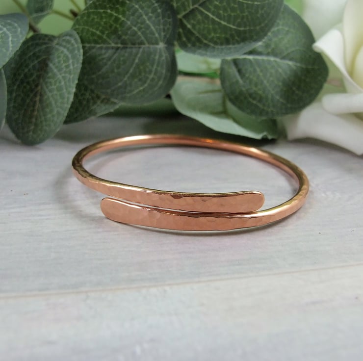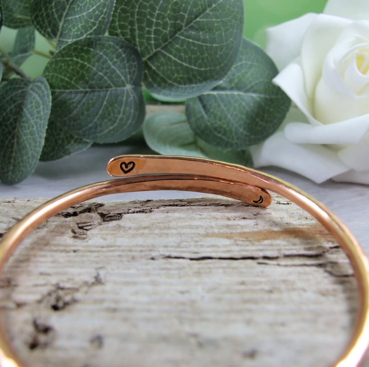 I have made the bangle from 2.5mm wide solid copper wire which I have shaped and hammered for texture stamping a moon and heart on the inside.