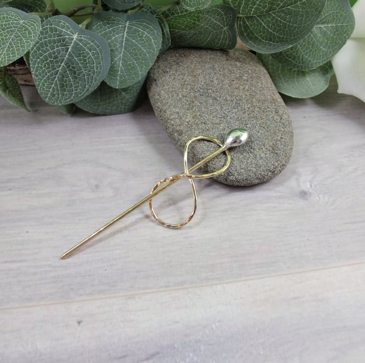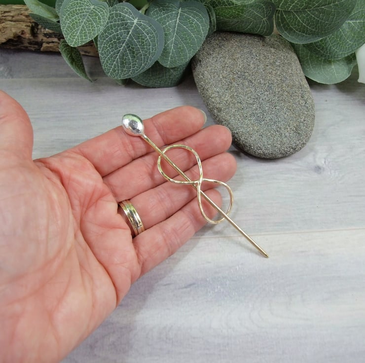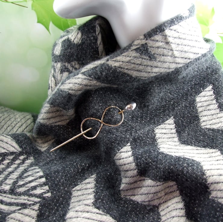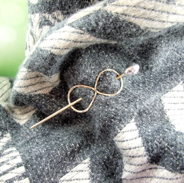Hand forged hammered Brass Celtic Infinity Knot Shawl Pin with Silver Pebble Topped Pin for Open Weave or Knit Shawl, Scarf, Wrap or Cardigan.