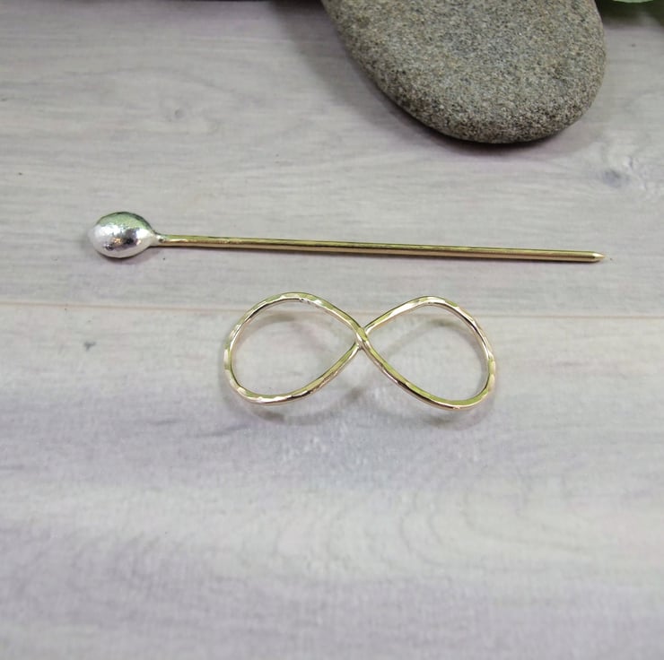 The infinity knot shape is hand forged from 2mm solid brass wire with hammered texture. The the pin is also made from 2mm wire, shaped with a rounded blunt point and a paddle shape at the other. At the paddle end I have added a recycled sterling silver pebble.