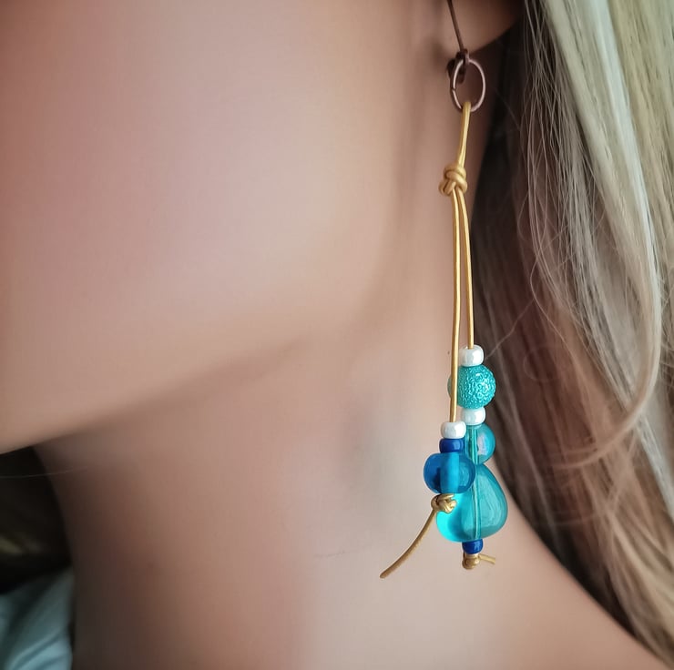 These gorgeous earrings are a lovely gift idea. These unique long earrings comprising glass dangling on leather cord will complement your seasonal look. The lovely honey gold colour leather together with the pretty blue glass beads blend together well. This design is my own and is eye catching yet delicately flattering.