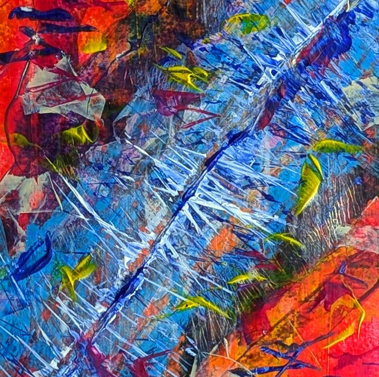 Made using Deadartstudio's hallmark blade painting techniques this painting reminds me of me of a chaotic evening in a reedbed as birds in to roost. It also has a fee and musical feel to it reminiscent of the work of Wassily Kandinsky.